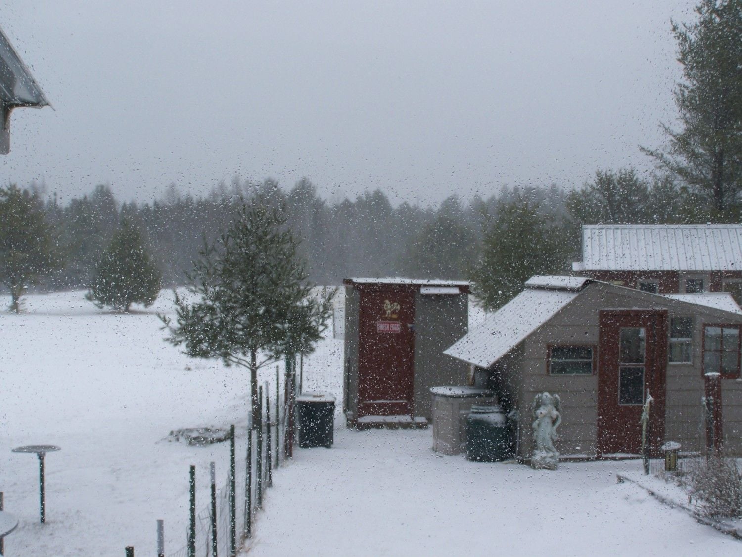 Looks like a great set up, would love to see pic w/out the "white crap" sure hope it is gone for you soon. My girls hated the white stuff too, but no problems with the mud and rain . . . the phrase "madder than a wet hen" does not apply since the rain brings on good worm hunting. They're just too stupid to pick the worm and quietly eat it. Gotta brag about it, then end up being chased by the rest, eventually I think they all end up with a piece of it![]()