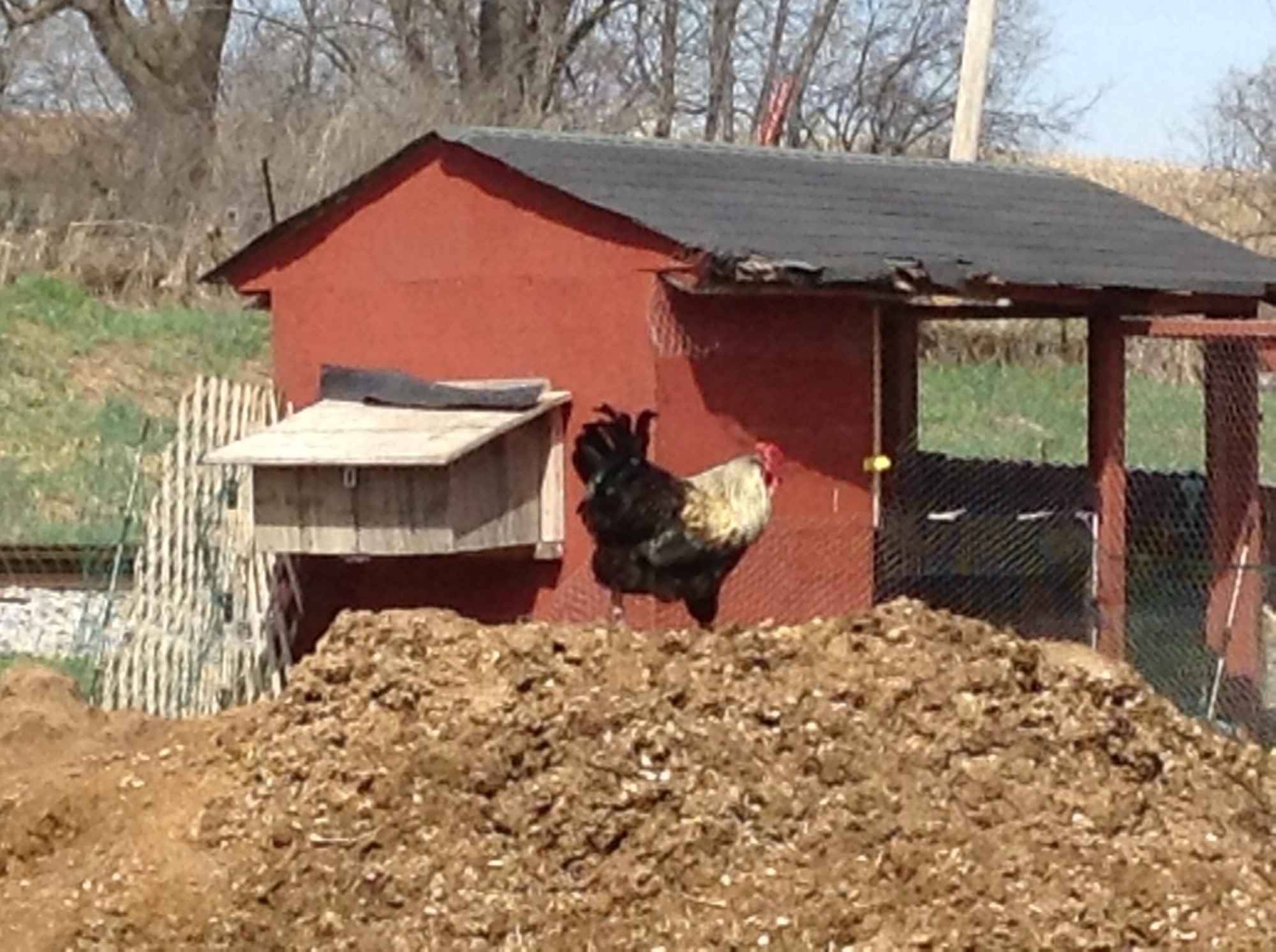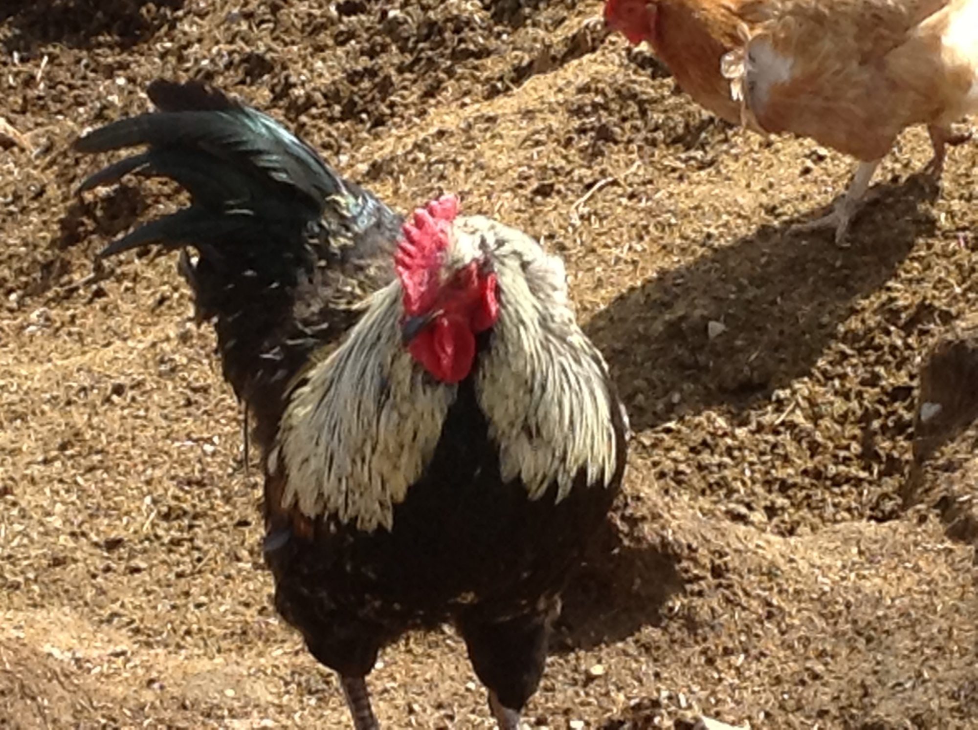 He sure is a funny boy! He still eats out of our hands and knows that if he grabbed another roosters girl he better make a bee line and hide behind me. That's delisha's Black Foot. He's doing a nice job surveying the hens taking horse poop bathes too. Well that and he can keep an eye on the SFHs in the pen behind him. He thinks the roosters have designs on his girls.