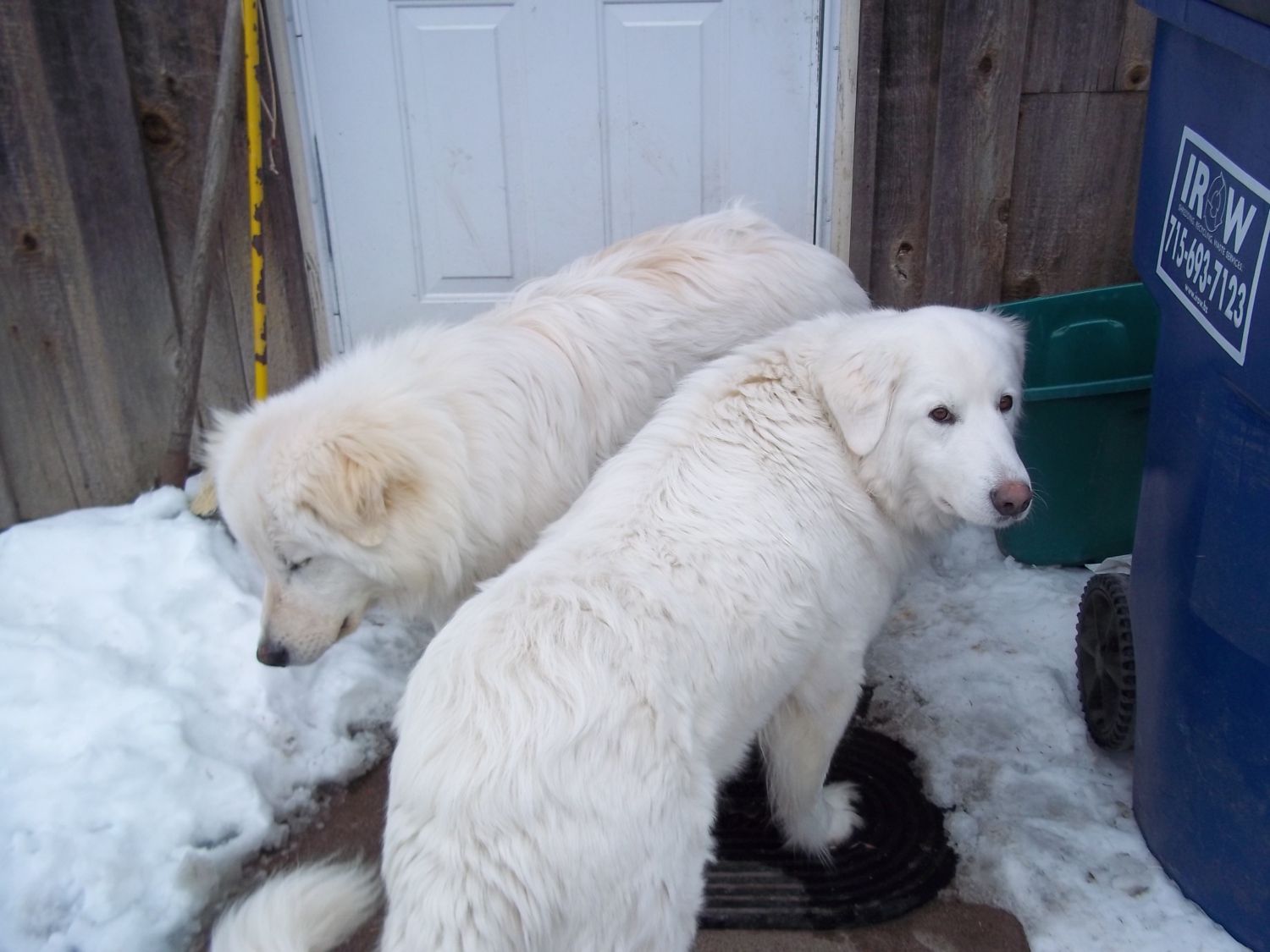 these are the two scrappers,, the one on the right is the older female,, Dora,, the left one is Puppy @ 7 months old.. they are not related.. they are Maremma ..