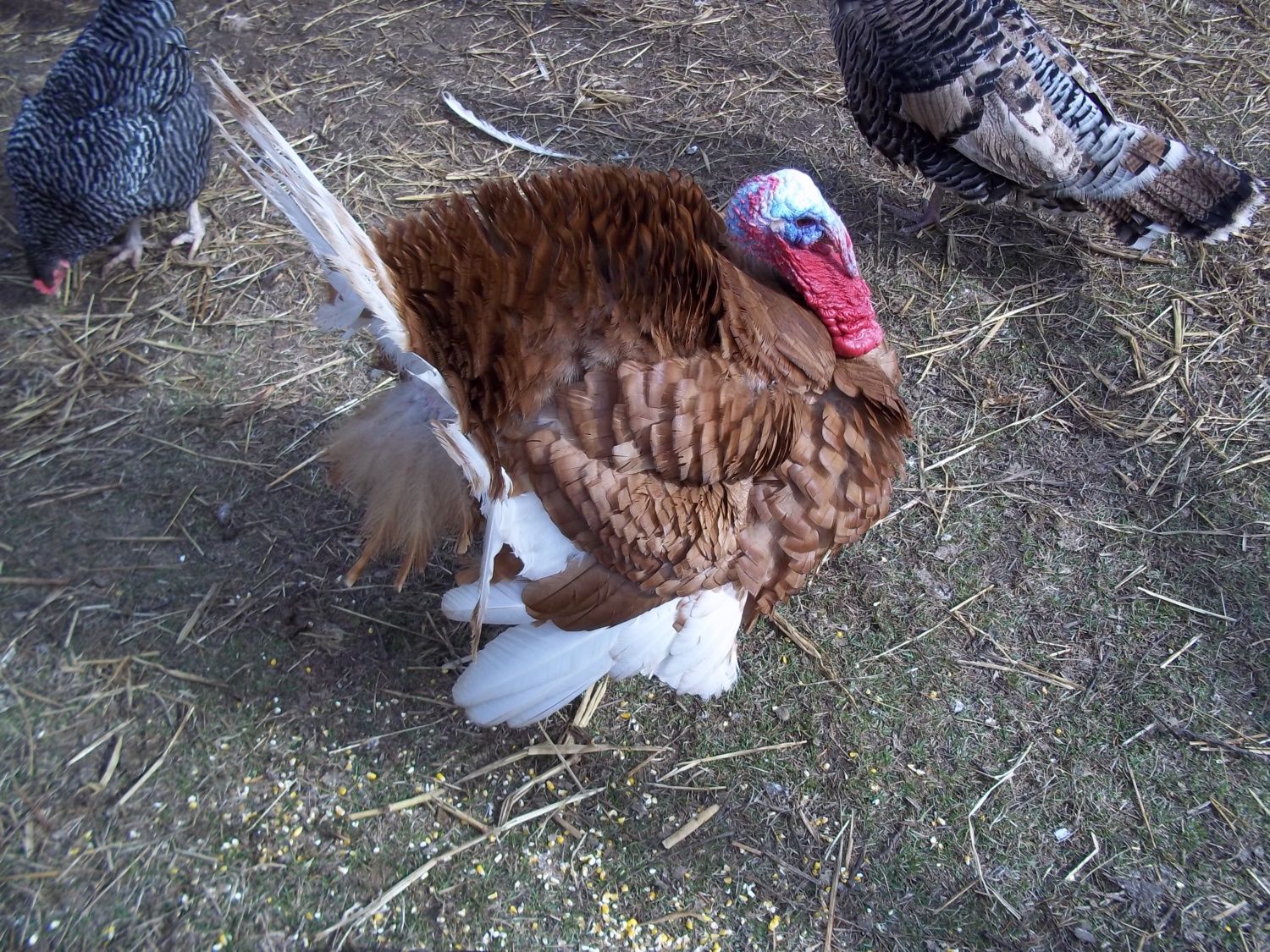 this is the bourbon red tom.. I wan not on the ball or I could have captured the whole turkey hen to his right.. I am not sure what kind of turk hens they are ? can anybody tell from the picture ? I was told they are bourbon reds ?? at any rate, I want to get rid of the trio.. at least one of them is laying an egg just about every day.. or maybe they are taking turns ? IDK