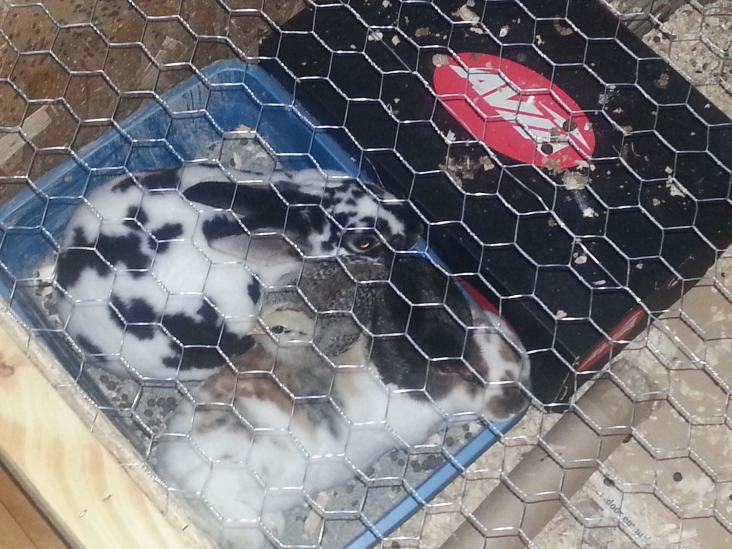Here is a pic of he chicks and the little bunny is their favorite. The big one was only inside for a few days. She had a small cut on her leg I wanted to keep surgical solution on.