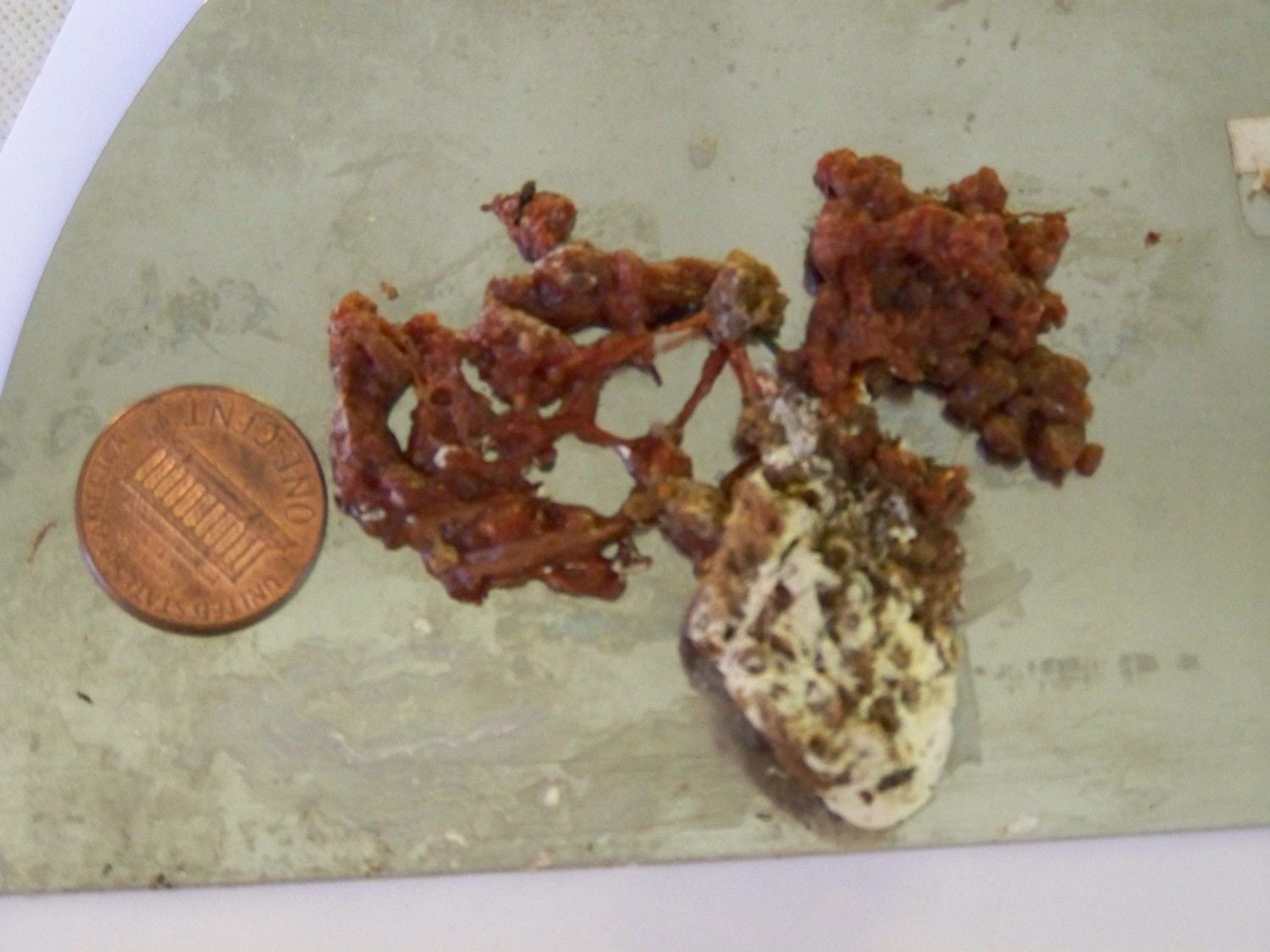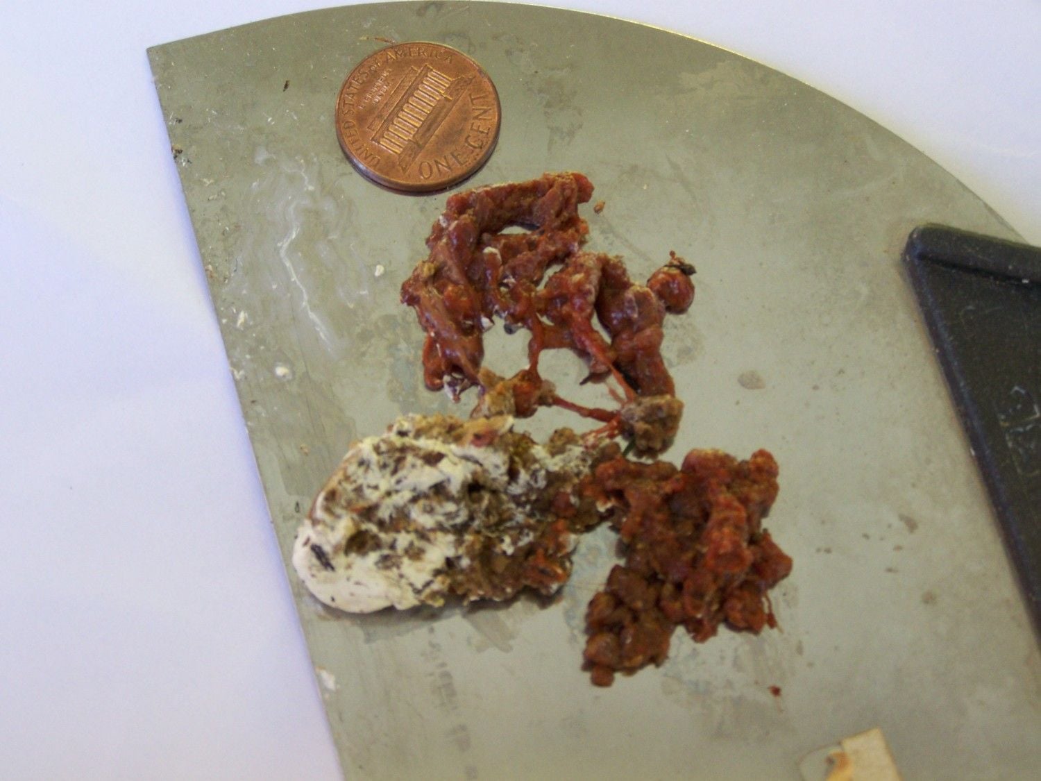 SORRY,, BEST I COULD DO WITH MY CAMERA. THE PORTION NEAR THE PENNY IS ALL TISSUE WITH SOME ON THE OTHER SIDE AS WELL. THIS OF COURSE IS CECA, I DID NOT LOOK FOR REGULAR FECES. WILL MENTION IF I FIND SOME.