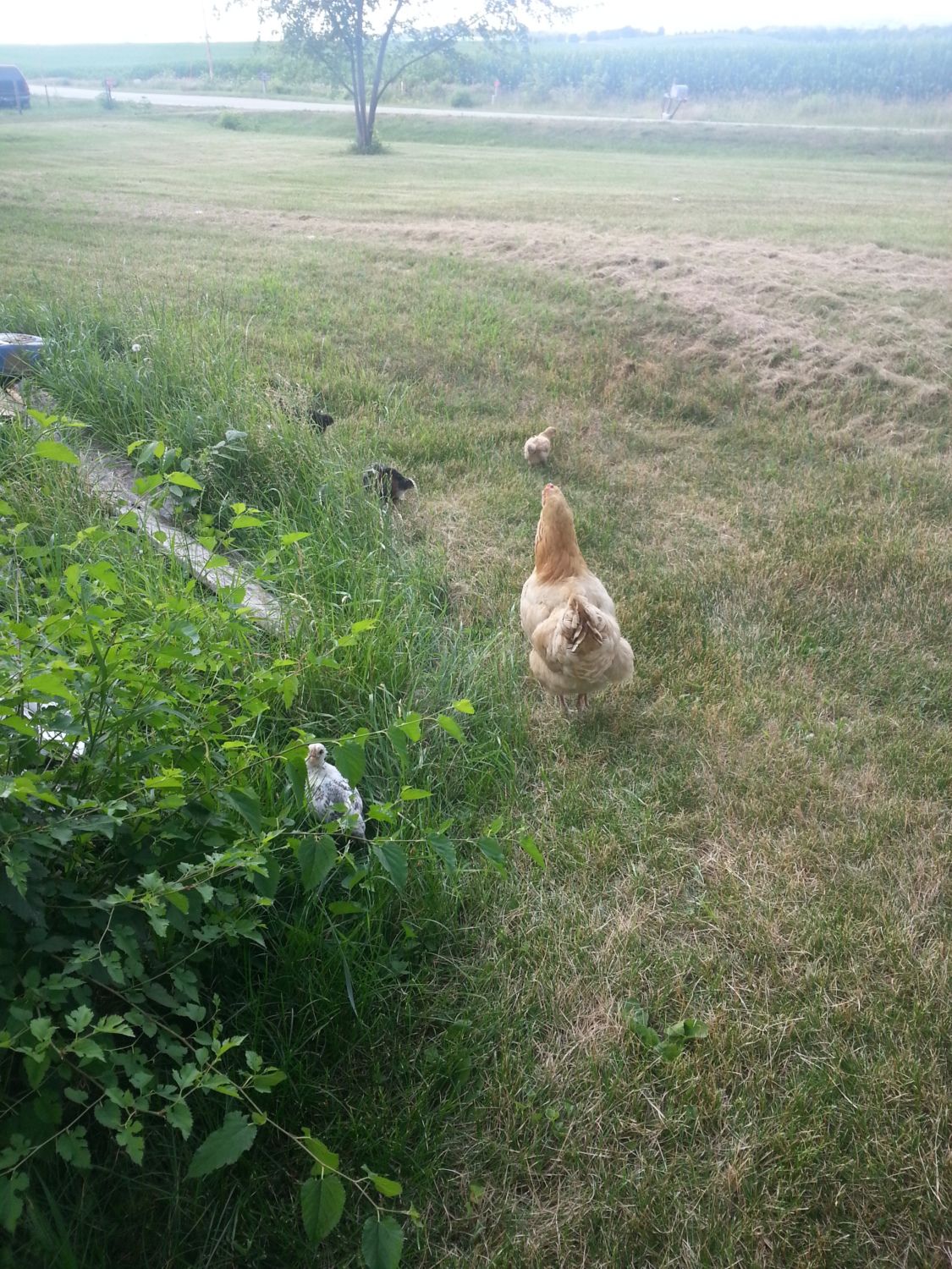 My 3 year old buff Orpington (Buffy) taking her chicks for a walk. She raised 2 broods last year.