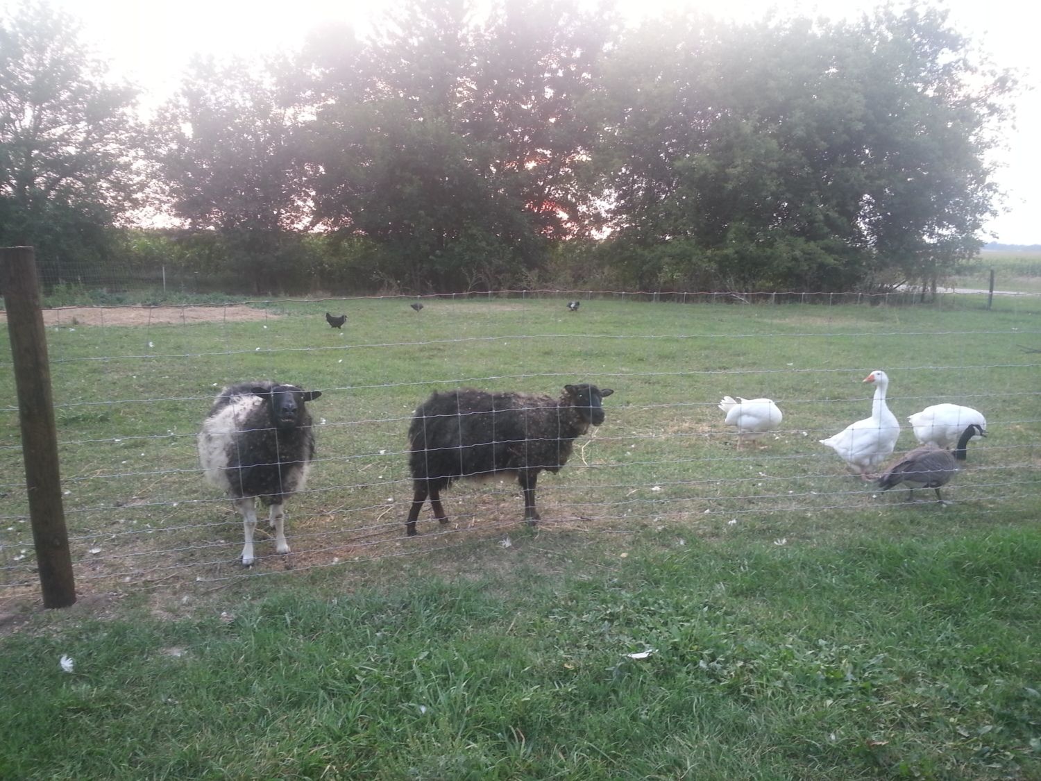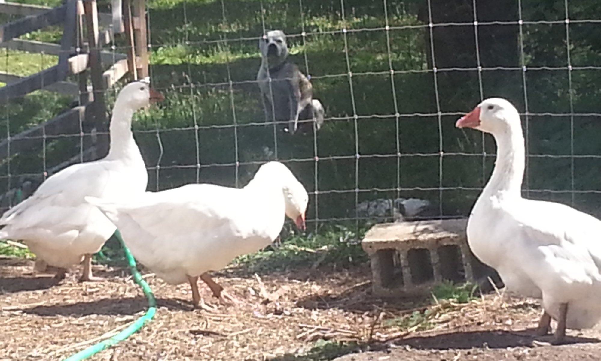 My old lady (Titania) guards the geese from behind the fence- safe from the ram.