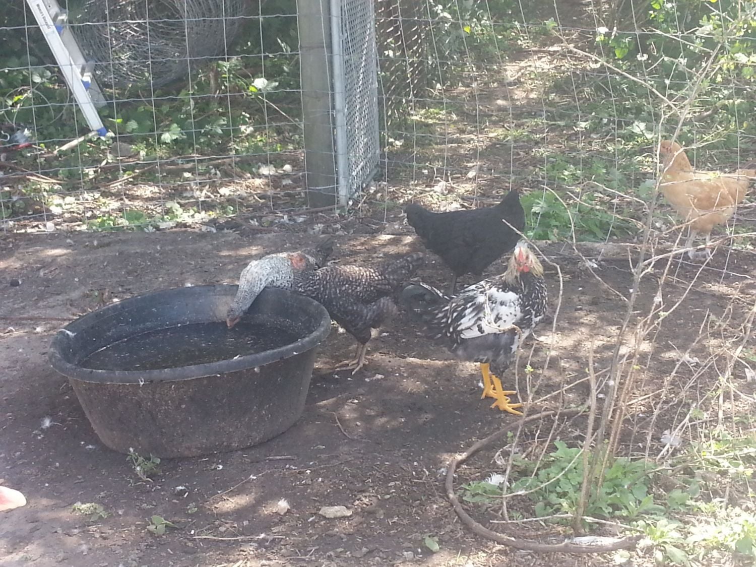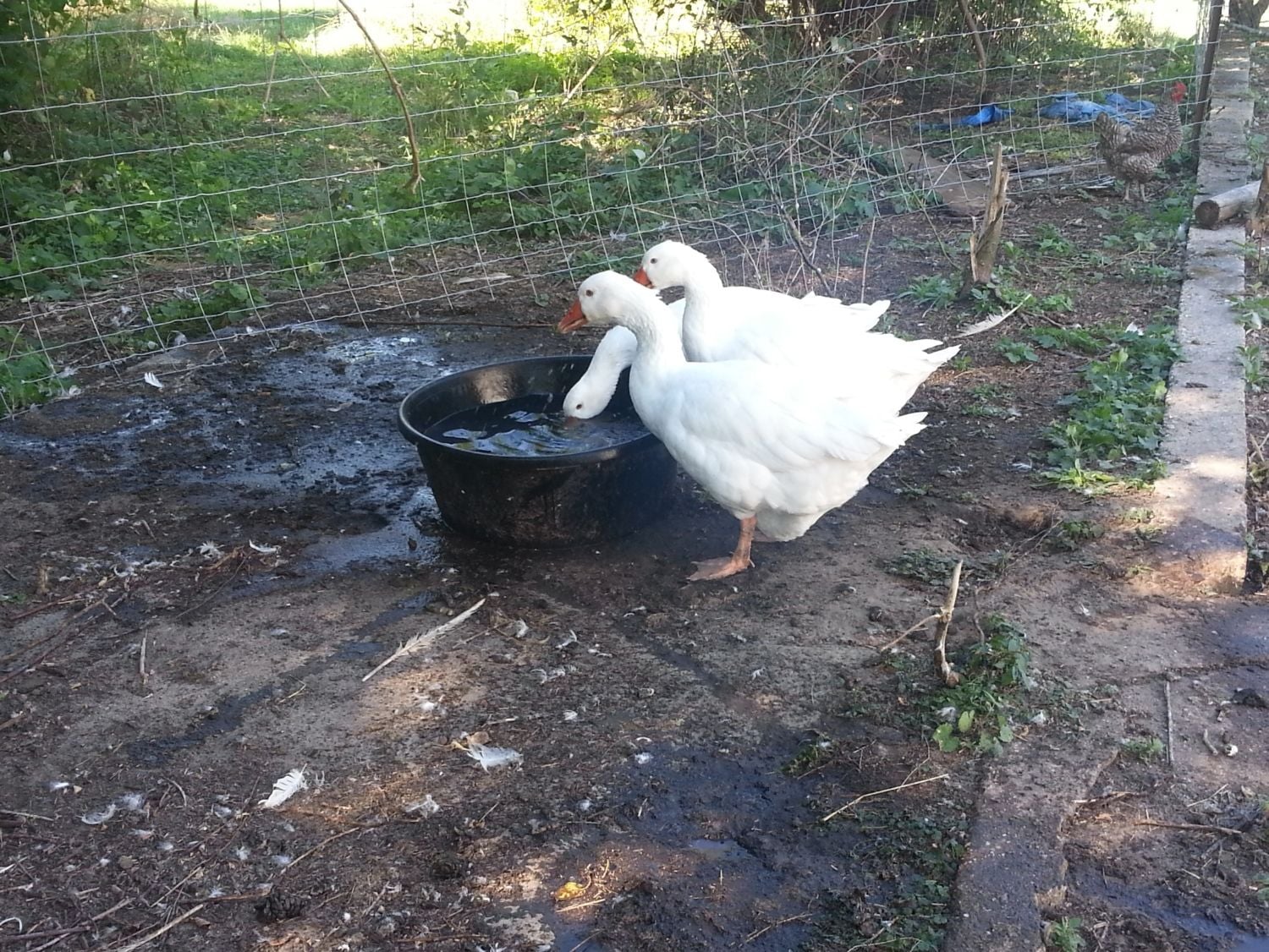 My geese enjoying their water bucket.