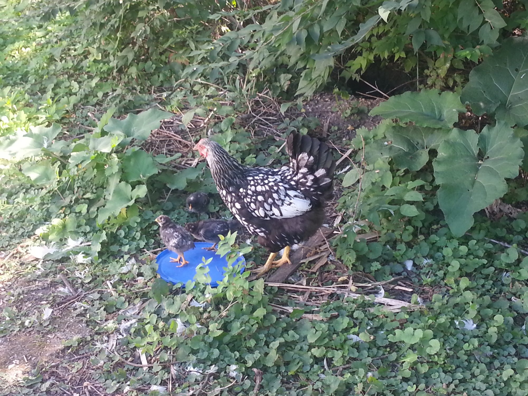 Sliver - My 3/4 GLW 1/4 CM hen with her brood. She is only one year old- but was very determined to be a mama- She hid her first nest so well she almost didn't move with us. Unfortunately between the transport and the heat none of her first eggs made it, but she did hatch out 5 in her second nest, although two didn't make it past the first day.