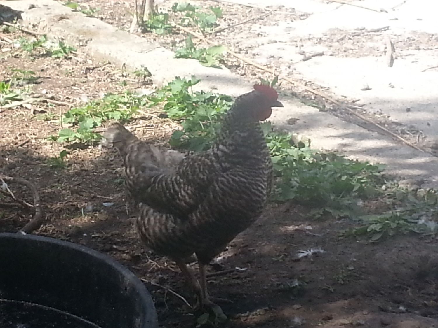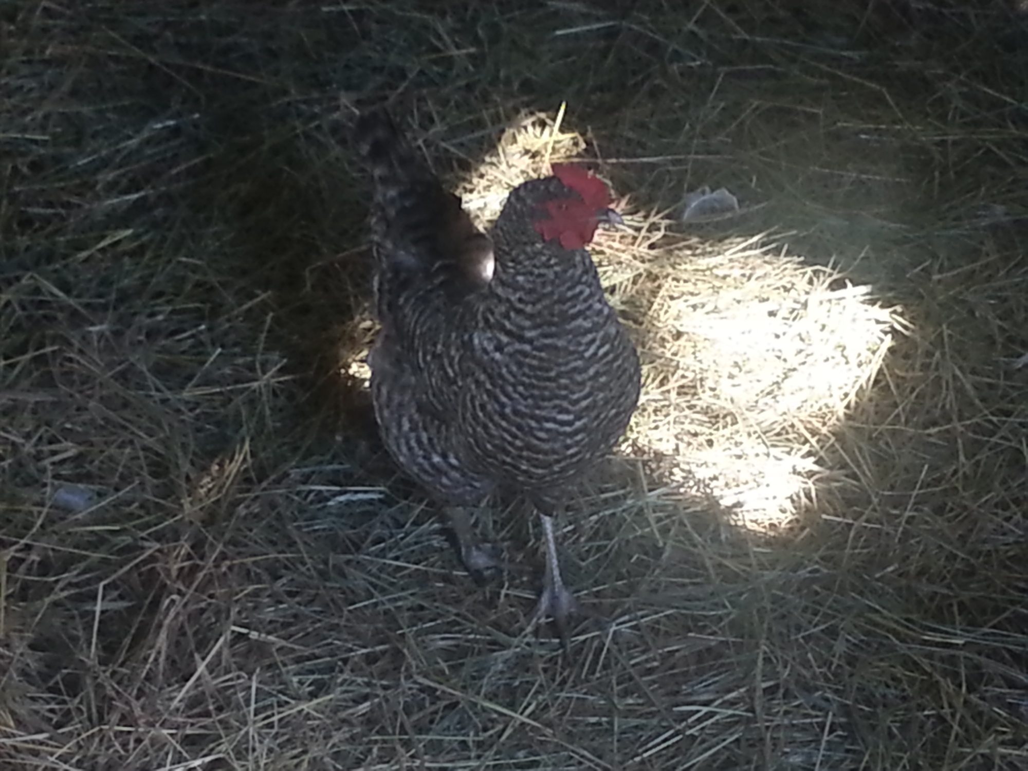 Head Honcho- a 3 year old 1/2 GLW 1/2 Cuckoo Maran cross. The Cuckoo Marans I had were a disappointment- never laid dark eggs, were small and were very flighty and ate over 200lbs of tomatoes with my EE's that year. They came from a feed store bin- so may have been missed labeled. I rehomed the two hens (with the EE's) I had but due to a stray dog the only roosters I ended up with were their sons. They were large, meaty and quick growing even if there mom's weren't, so it has worked out well.