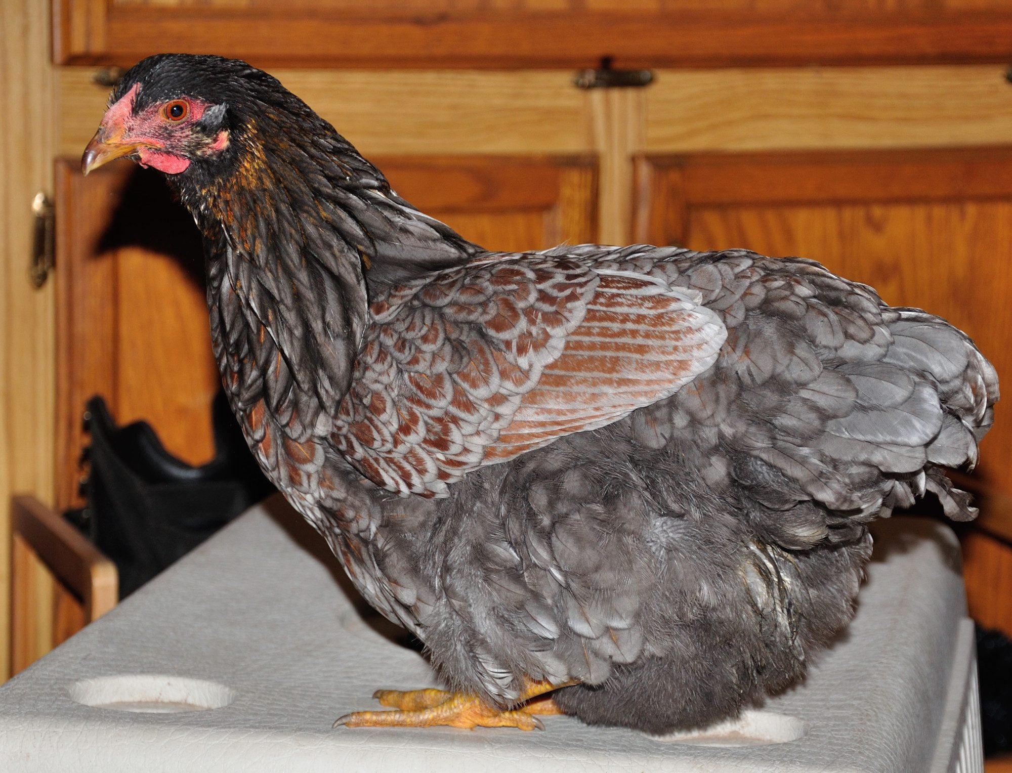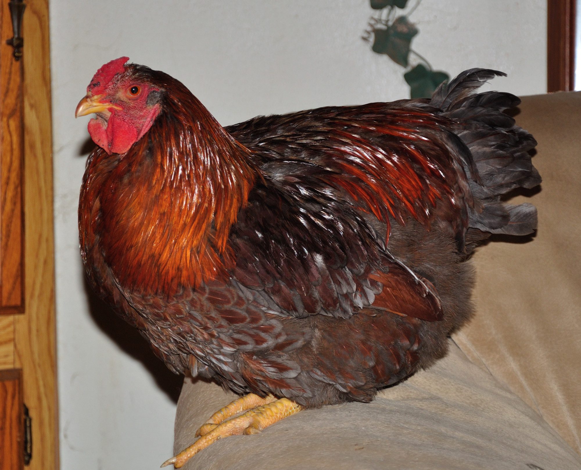 does well for your breeding purposes! He is an awesome roo. He loves to eat, will always be the first (or one of the firsts) out of the coop running over to the food scraps. He is very patient and kind, gentle and encourages the girls when they are laying eggs. That was when I heard his first crow...he announced an egg being laid! Give him a great big hug for me!