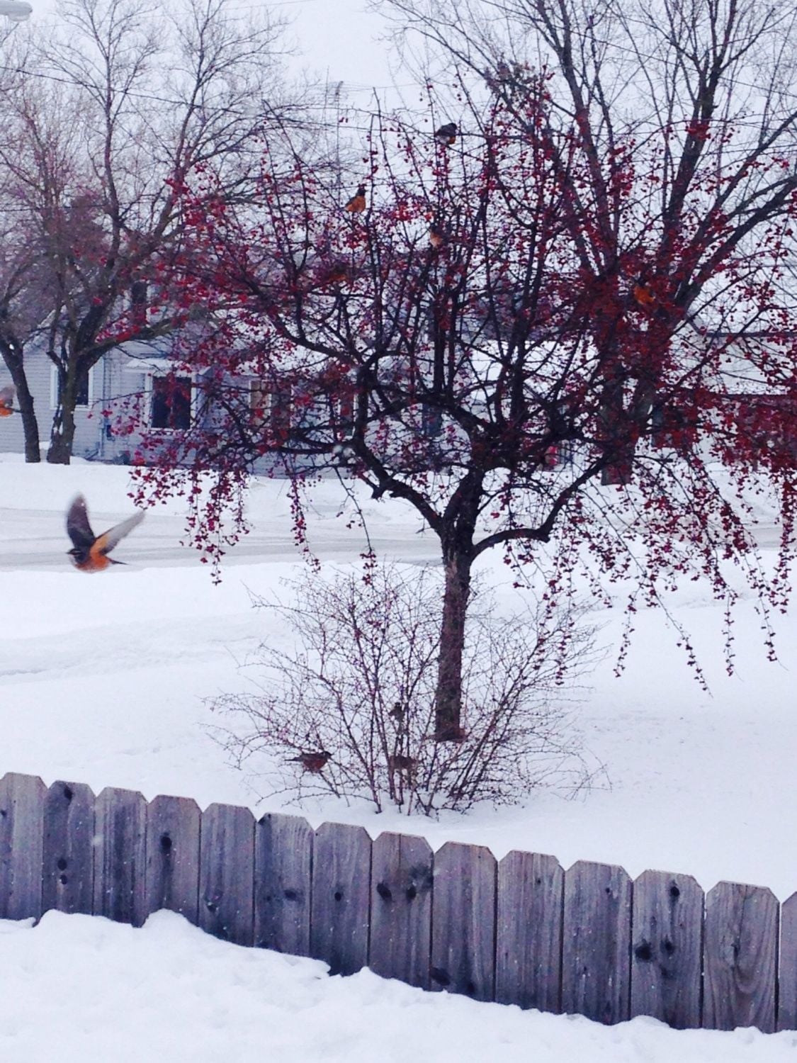As I pulled into my neighborhood tonight, I saw around 30 crows in a flock. The birds in your picture must have decided the berries in the tree were all they could find, whether tasty or not, time to eat them.
