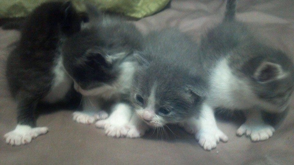 And I have 4 kittens black/white and grey/white for free and also grey/white and black/white mitten kittens I'm selling for $50 each. Photos below also.