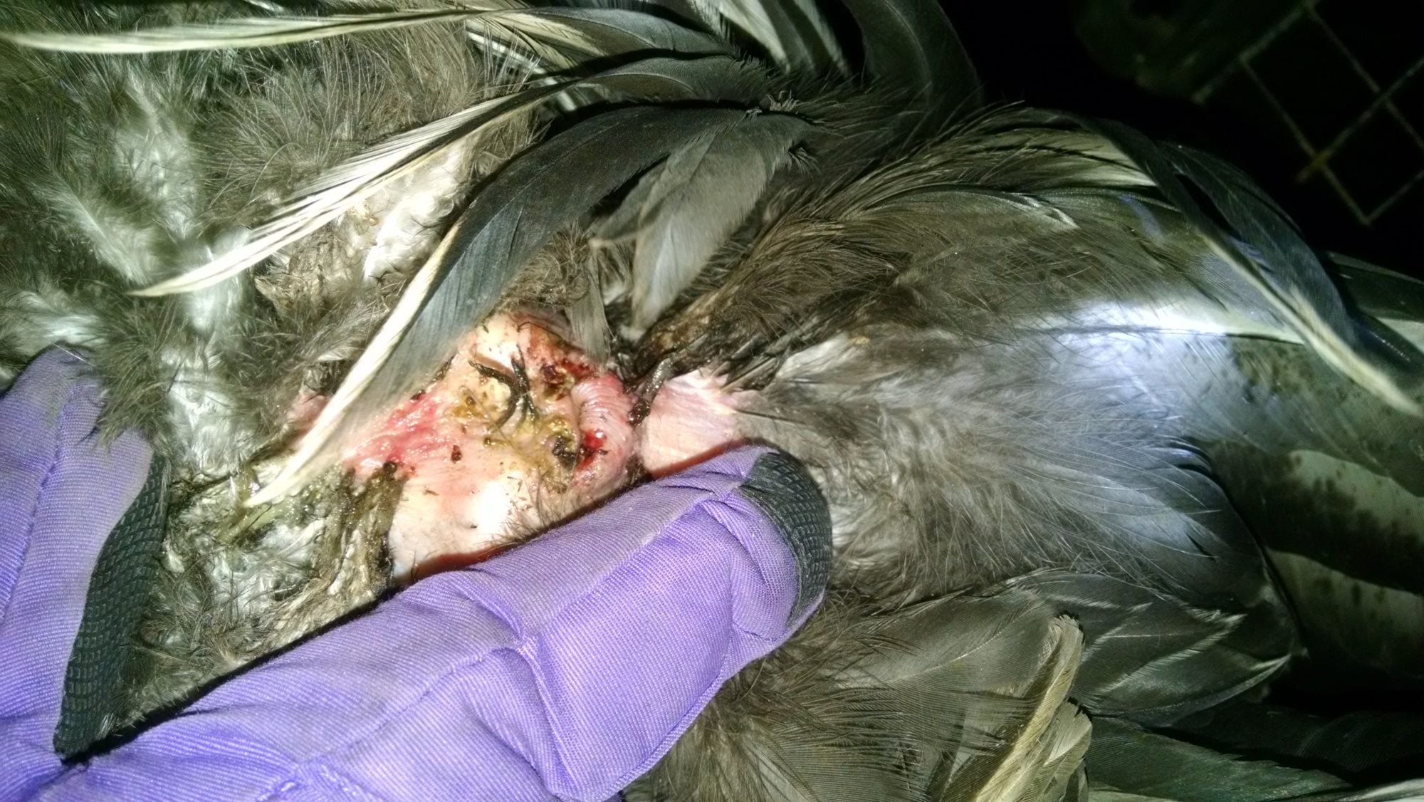 This is the vent of the IB roo a few hours after treatment. You can see the infected areas around the vent. He's doing much better now after a week of being cared for as are the rest of the birds but it's going to take some time to get them all back in complete health.