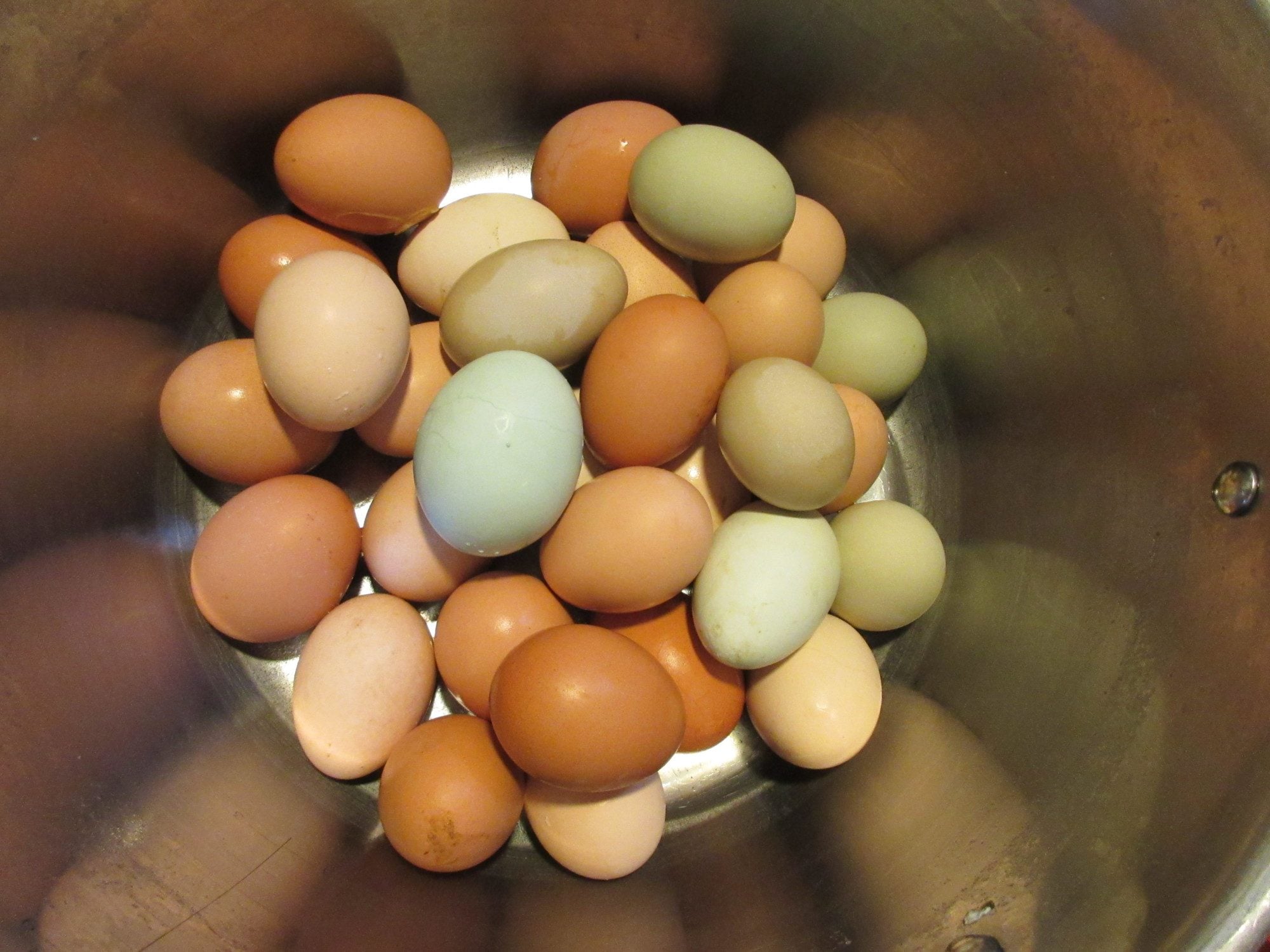 I thought this pic was so neat...boiled eggs collected yesterday. That one on the top is really big and really blue! I have so many eggs it's not funny...the state called me again and said that because there is another farm that has AI in this county and they didnt get to me for a retest last week, they will be coming in two weeks to do my retest when they are doing the additional 80+ new farms that are within the circle of this new one. I have a feeling that this will never end!