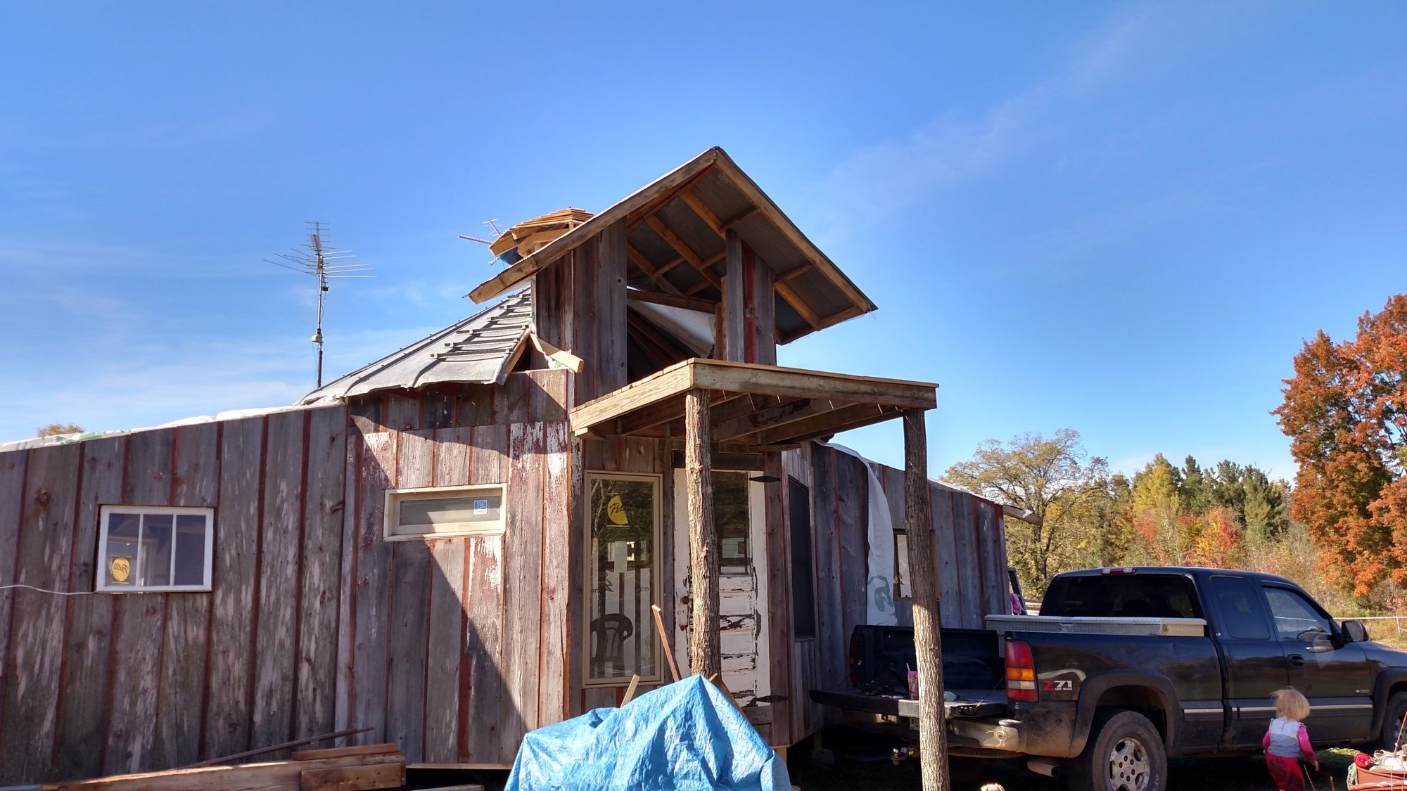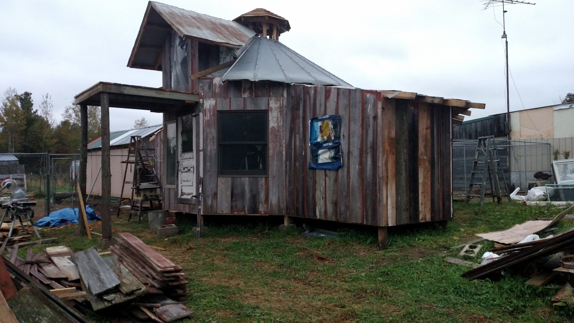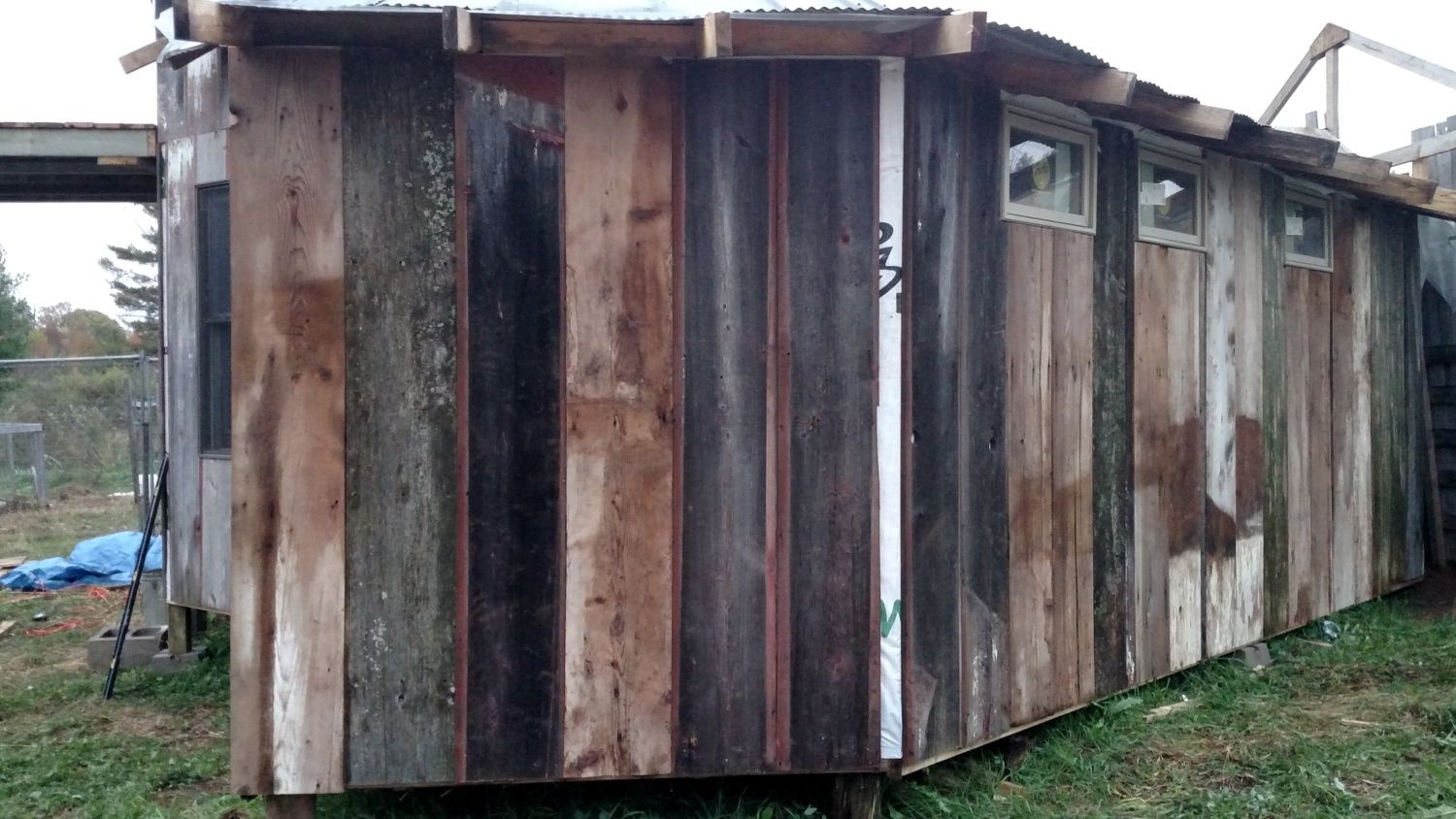 Got most of the boards on the outside, just have to trim out the windows and such yet.
