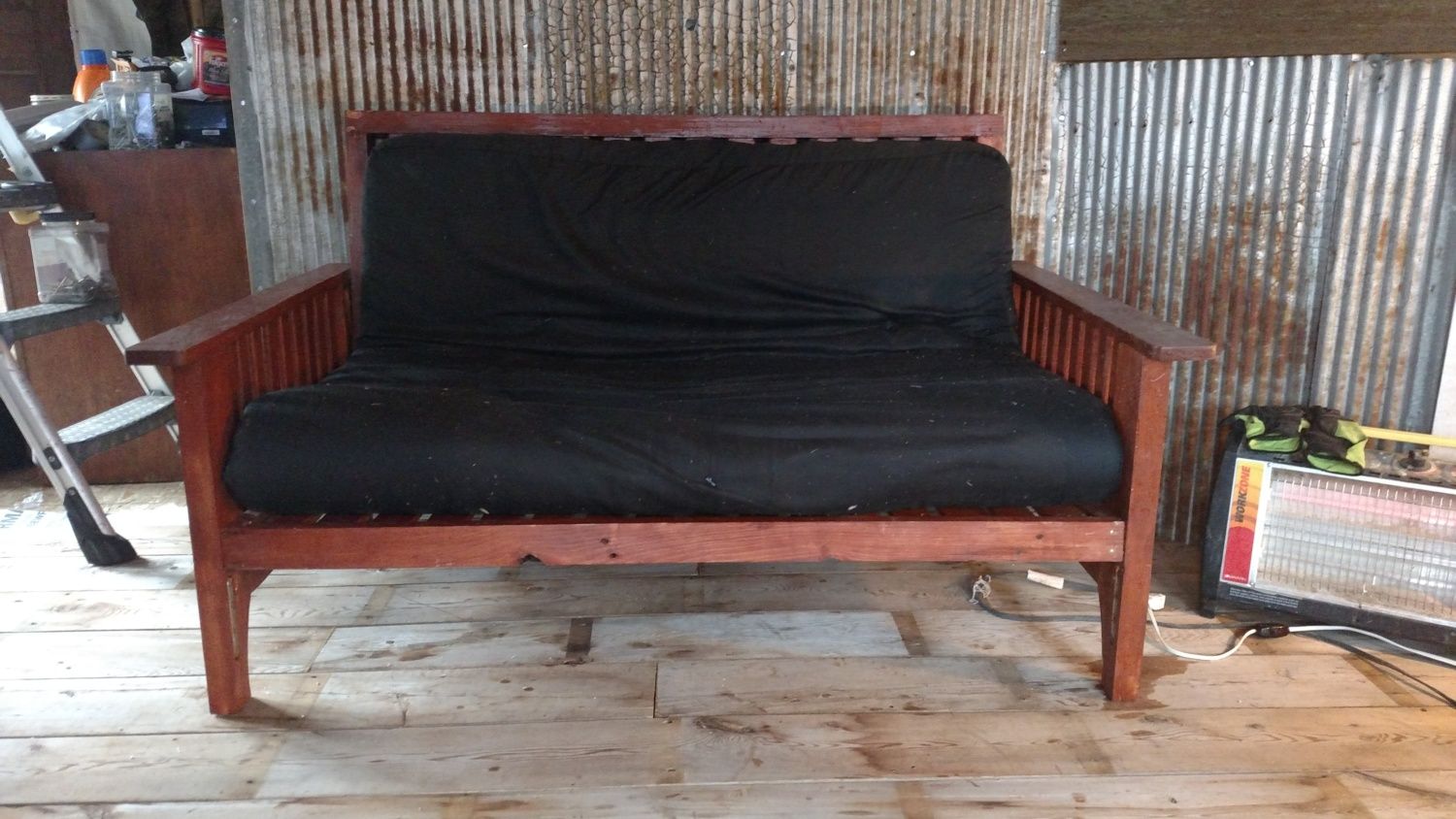 This was a full size futon, but had to cut down to fit. Turned the mattress and doubled it in the sitting part. It's no longer functional as a futon but it will be ok or now as a love seat.