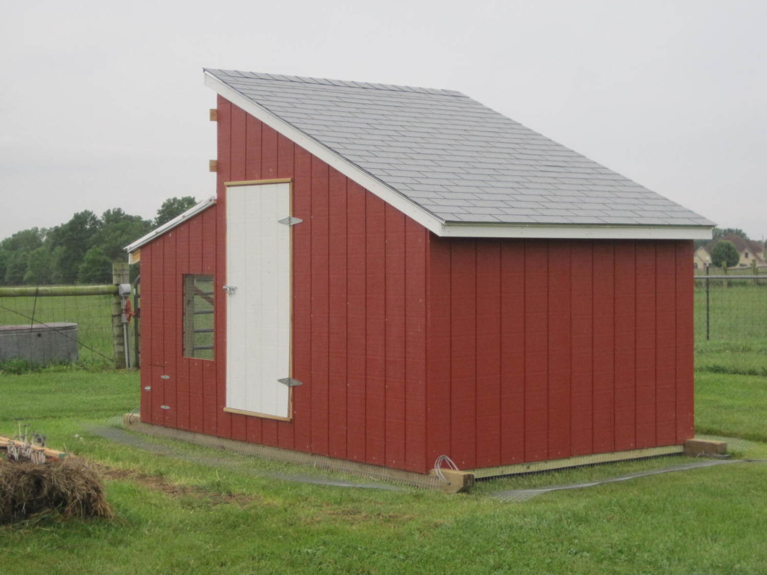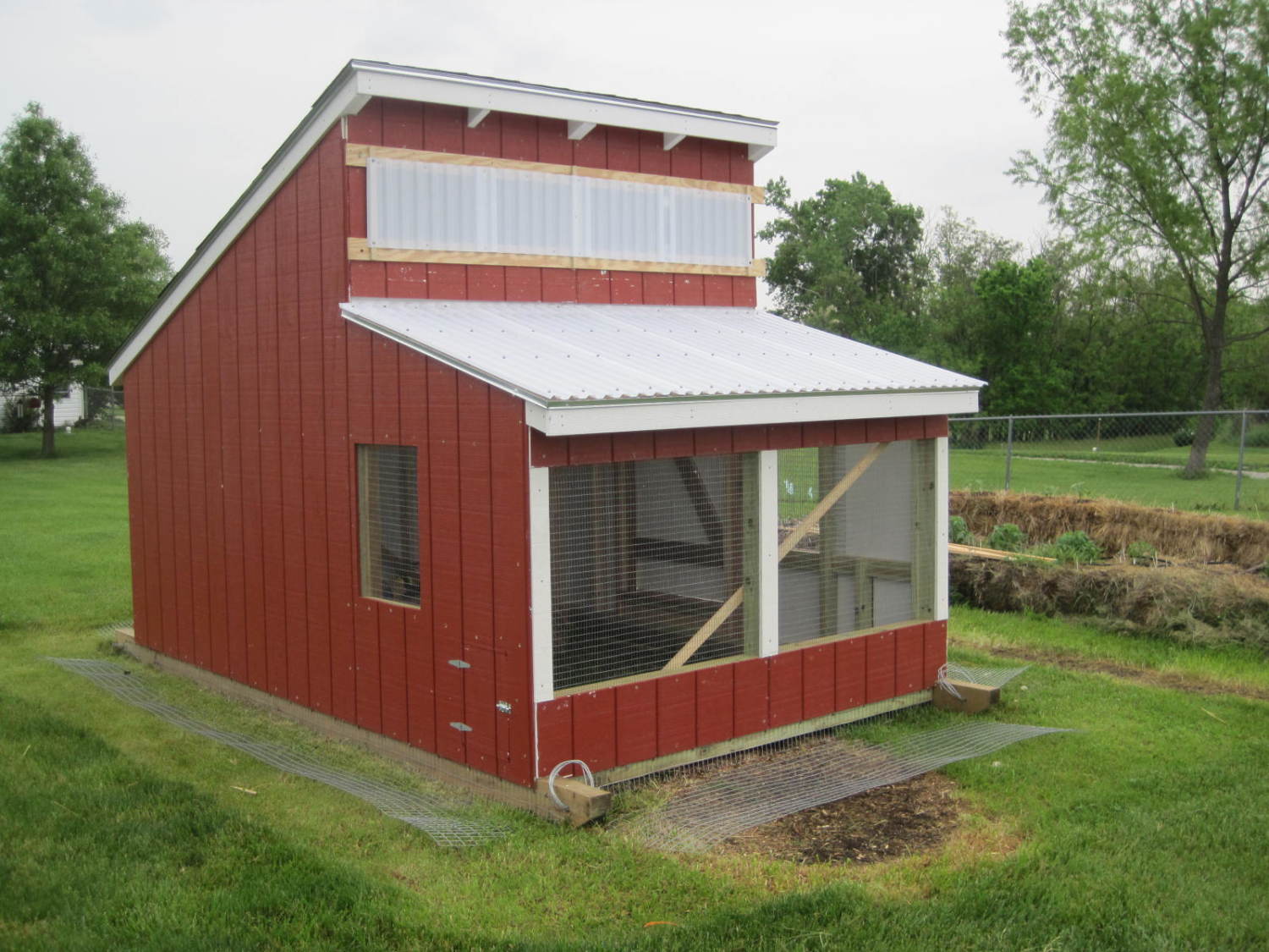 The last photo shows some of the details that make this portable (built on 4" x 6" treated timbers for skids), and also how I went about installing the wire apron around the perimeter to keep digging predators out. That I had a really tough time finding a way to run an extension cord into the building to use for a heat lamp makes me think a predator will also have a tough time making it in. If he does, I won't be happy about it, but I would be impressed by his skill in defeating me.