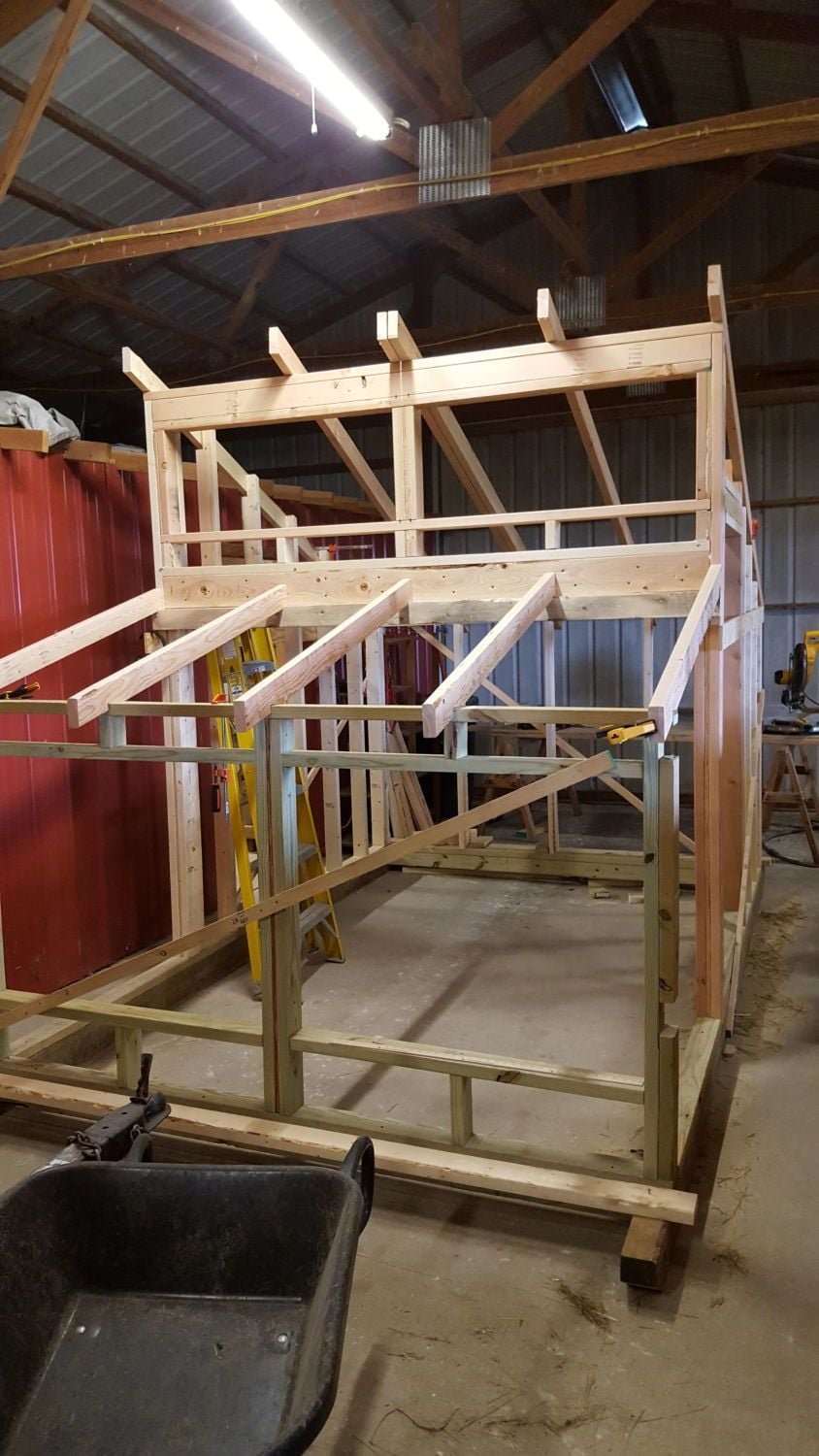 Anyway, once I was convinced this was the way to go, a decision had to be made on how big. Woods 10' x 16' was too big for my use and his 6' x 10' was about right, but for what seemed like the same materials, I could up that to 8' x 12', which is what I did. I also decided early on this building would be portable........more like can be moved......vs. portable in the "tractor" sense. I do plan to move it around......perhaps once a year or so, if not more often. Initially, this will be used to grow about 15 pullets, some of which are my daughters and will be heading off to her place once they feather out and don't need the heat lamps to survive. That will leave me with about 8 or 9 birds, which are the most I intend to keep. More like 6 or so most of the time, with some allowance for losses.
