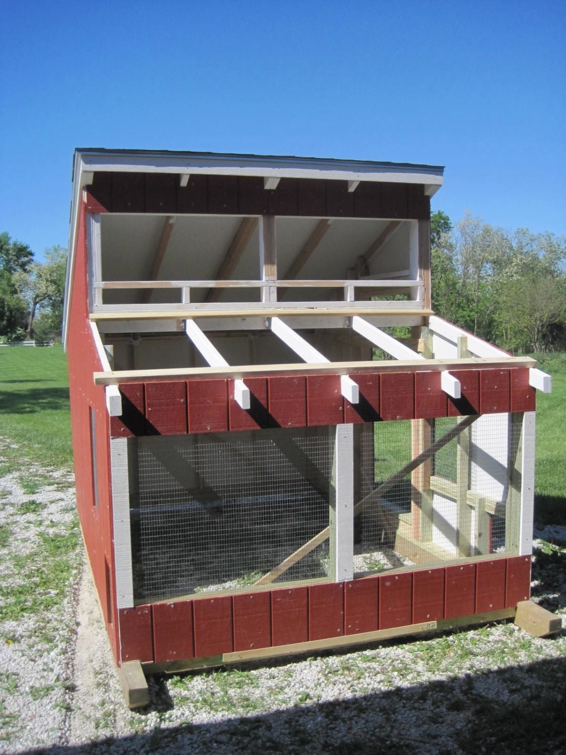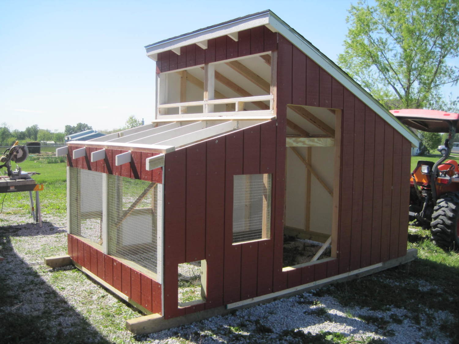 Anyway, this is not complete.......lots of trim work and other finish work left to do..........a screen door and monitor windows and window screens to build, but is ready for occupancy, which is a good thing, as I have those 15 - 2 week old birds that are rapidly outgrowing their brooder box and need a proper house to occupy. Weather permitting, move in day is tomorrow.