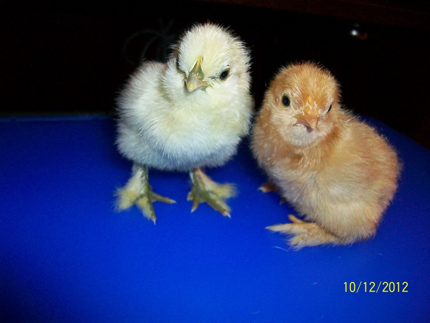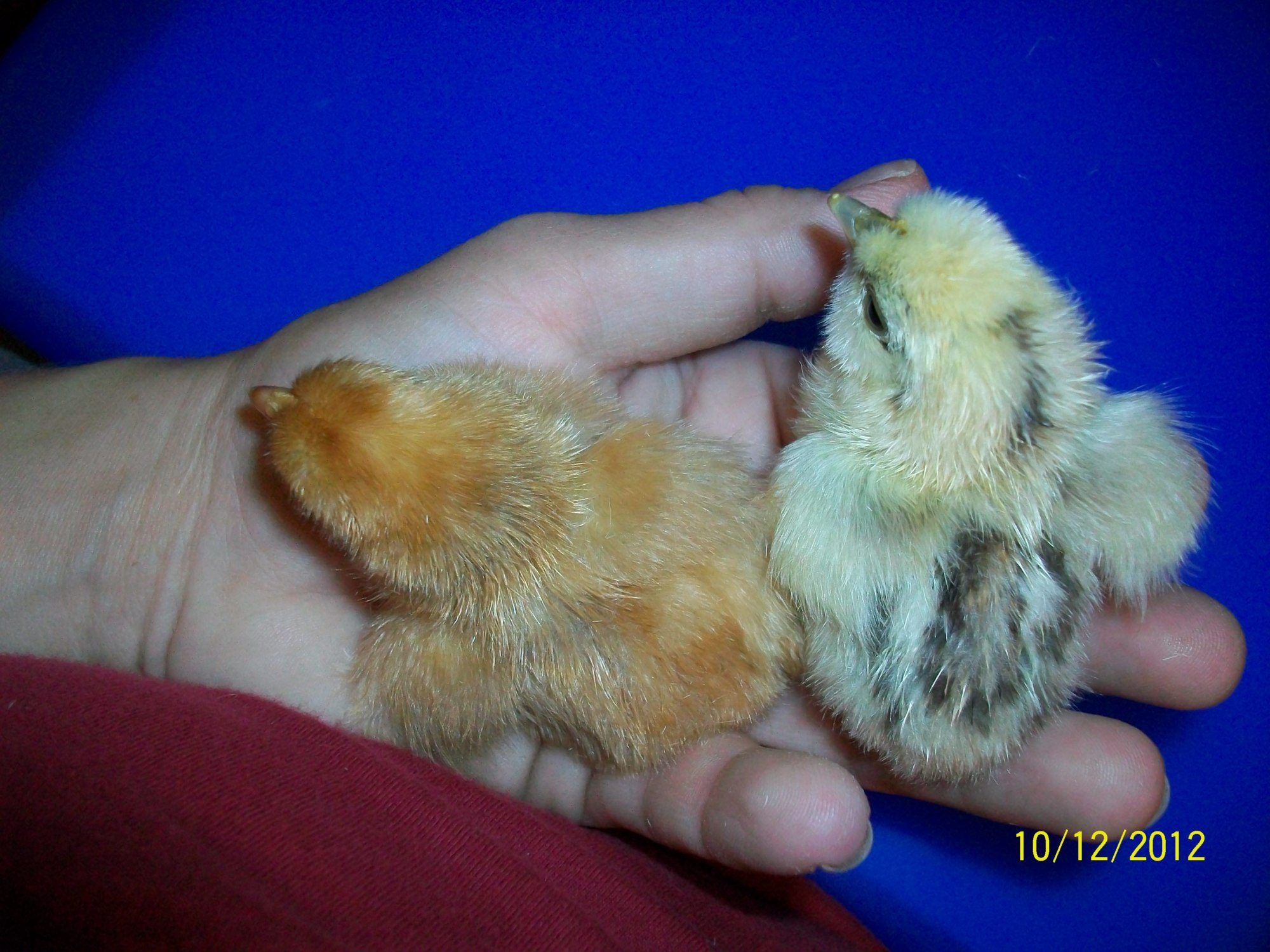 Here's my 2 that hatched yesterday they are all dry and fluffy!! Still waiting on the other one to do something. I thought I only had 1 hen laying but the little buff/red colored one is the first one to look like that and all the other chicks have had black skin. the other one is unknown the mom is a silkie/cochin mix and the dad is either a silkie roo or a mf belgian d'uccle roo any body want to guess the dad for me?