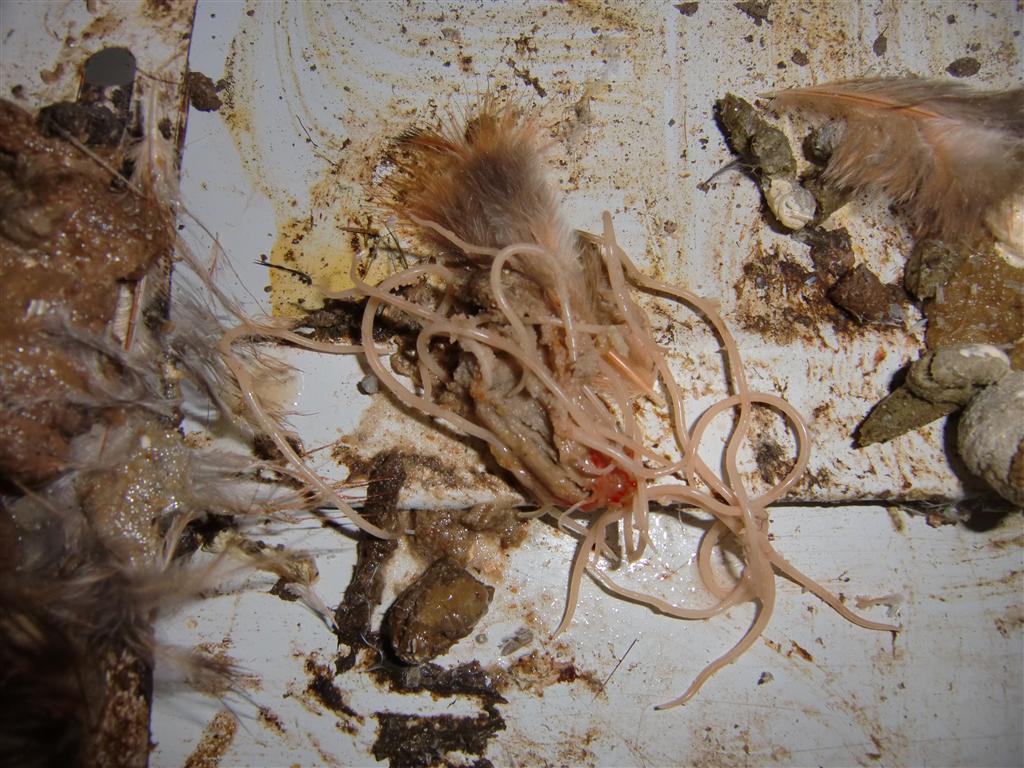 Those are large roundworms, looks like an infestation at that. I recommend using valbazen cattle/sheep wormer. Dosage is 1/2cc orally undiluted for standard size birds, 1/4cc for smaller birds. Redose again in 10 days. There's a 14 day withdrawal after last dosing.
