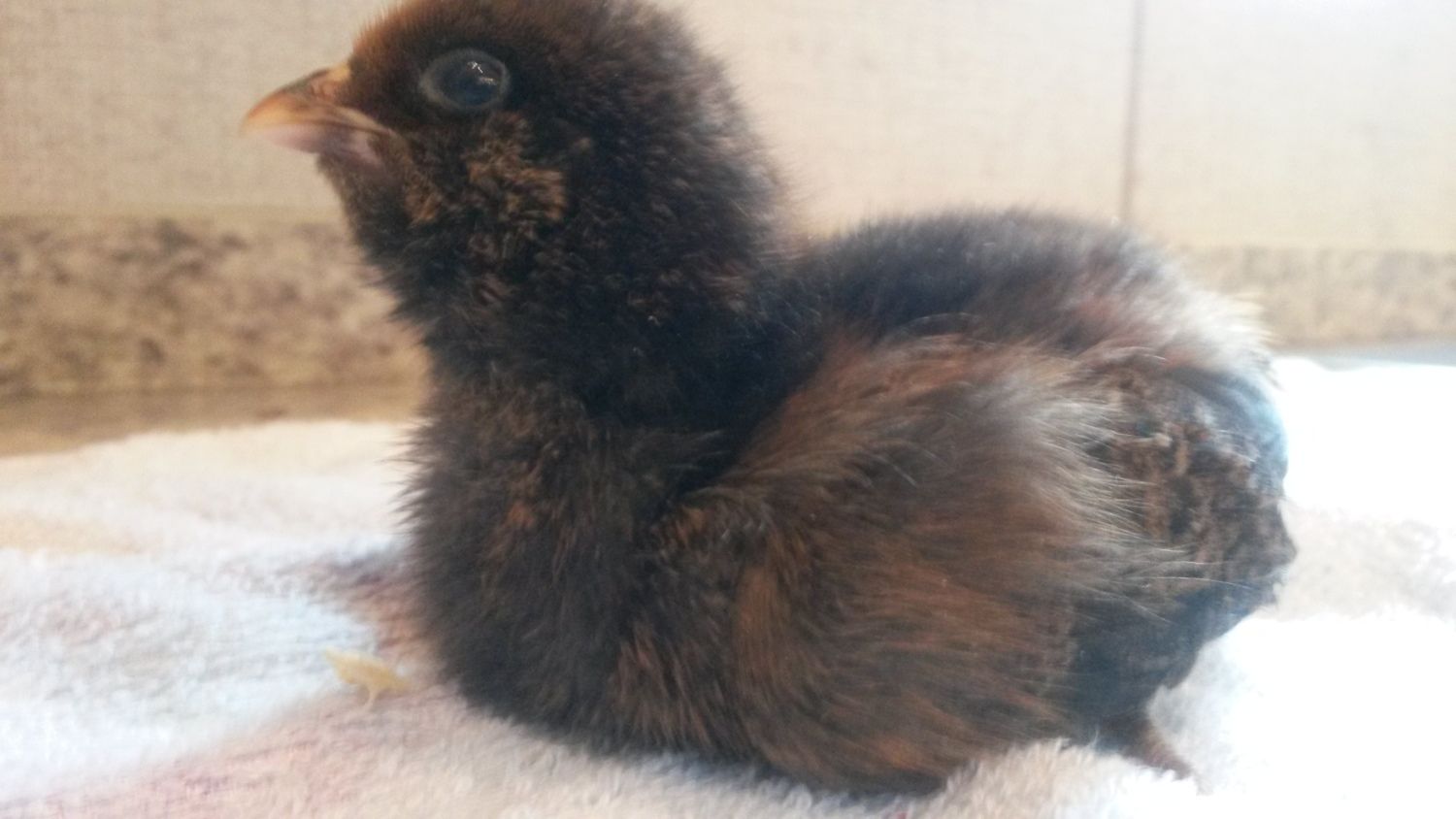 The next bin held white turkeys. The bin beside that one held RIRs. There were no other chicks that day. In with the Australorps and Sex Links was this cute little chocolate brown. The cheeks are a little fluffy. I bought it because it was the only one and no one at Atwood's could tell what it was. They checked the bins and labels several times.They put him in with the RIRs and then removed him saying he wasn't a RIR either. He is almost a brindle brown and they were red. He stood out like a sore thumb. They had about 4 people try to tell what it was but no one knew. I finally said, "it's just a chicky, I'll take him home and try to figure out what it is". I didn't want them to waste anymore time since they were very busy on Memorial Day. I thought maybe it was a Sex Link but they insisted it wasn't.