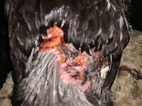 She wasn't bleeding but does have some raw cuts. They look more like chunks of flesh missing and I didn't see any obvious puncture wounds. There is a chunk of flesh missing that is about a quarter inch deep and two inches long near her tailbone. That looks like the fatty layer that holds the feathers was pulled off along with her feathers. Most of the back of her tailbone is raw. There is another spot on her side kind of under her wing that seems more concerning. It isn't nearly as deep but I can see what looks just like raw chicken breast meat.