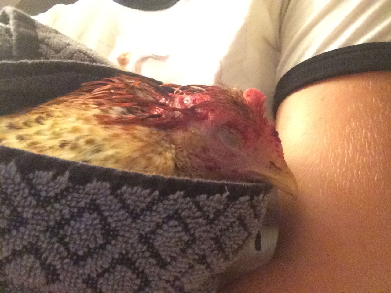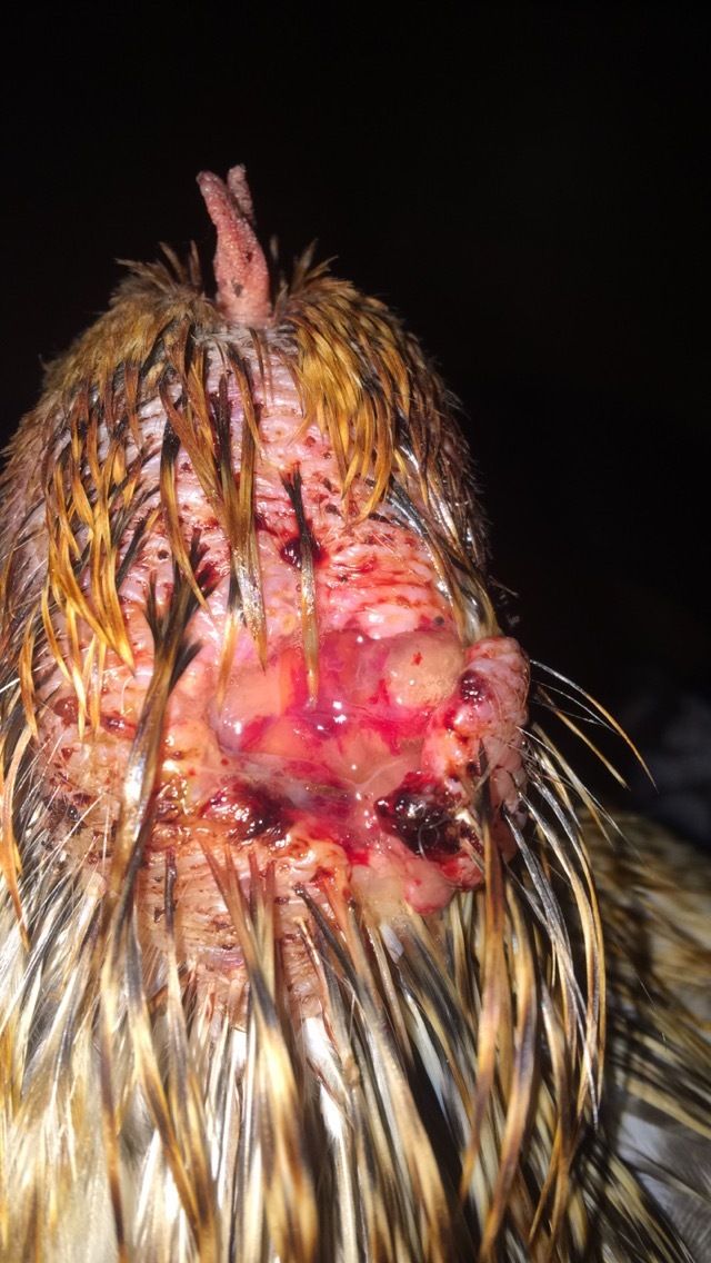 This is Vivi. She's my newest addition. She's been trying to make friends with my flock for about a week now. Last night, I put her on the roost and she was attacked this morning. When I am in the coop/run, nobody seems to try and touch or come near her, so I thought that it'd be fine to put her on the roost. This was also the third night I put her on the roost. The first night ever she was attacked and a few feathers were ripped out but she healed quickly. The second night, nothing happened and the third night this happened. As you can see, her skin was ripped and she does have a piece of skin that is just like a flap. The cut is very deep. My friend who raises horses and mother is a doctor talked to me over the phone as to what I should do. I tried to apply pressure to it to stop the bleeding but she didn't like that at all. Then I tried to rinse it a little bit with just plain water but she kept shaking her head which would then make the flap of skin move around and slap back onto the wound (ouch). They ended up driving over to my house and bringing me a medicine they use on their horses wounds called bactine. Its a first aid antiseptic and pain reliever. I'm going to let her stay inside the house for a few days until it begins to heal a little bit and then I am going to set up my 4 foot by 6 foot rabbit cage for her to stay in (no rabbits). It's right outside the chicken run so they will be able to see and hear her so that will also help with the introduction process. She is eating, drinking, pooping, and walking around normally. I feel so bad for her. What should I wash it out with? I was thinking peroxide mixed with water? Also should I wrap it up to keep it away from flies.