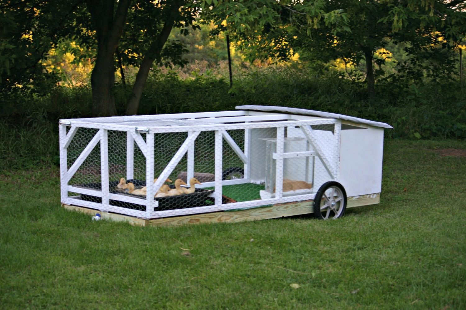 Rich, this sounds a lot like what we made, although not pretty. We have several duck houses or "installations" and hubs calls them. This one can be wheeled around, and sprayed out daily of mess. The tub of water has a valve on it and is opened to allow drainage and cleaning daily. The back is a wire floor which I now just cover in litter. It's not in use now, but will be in the spring.