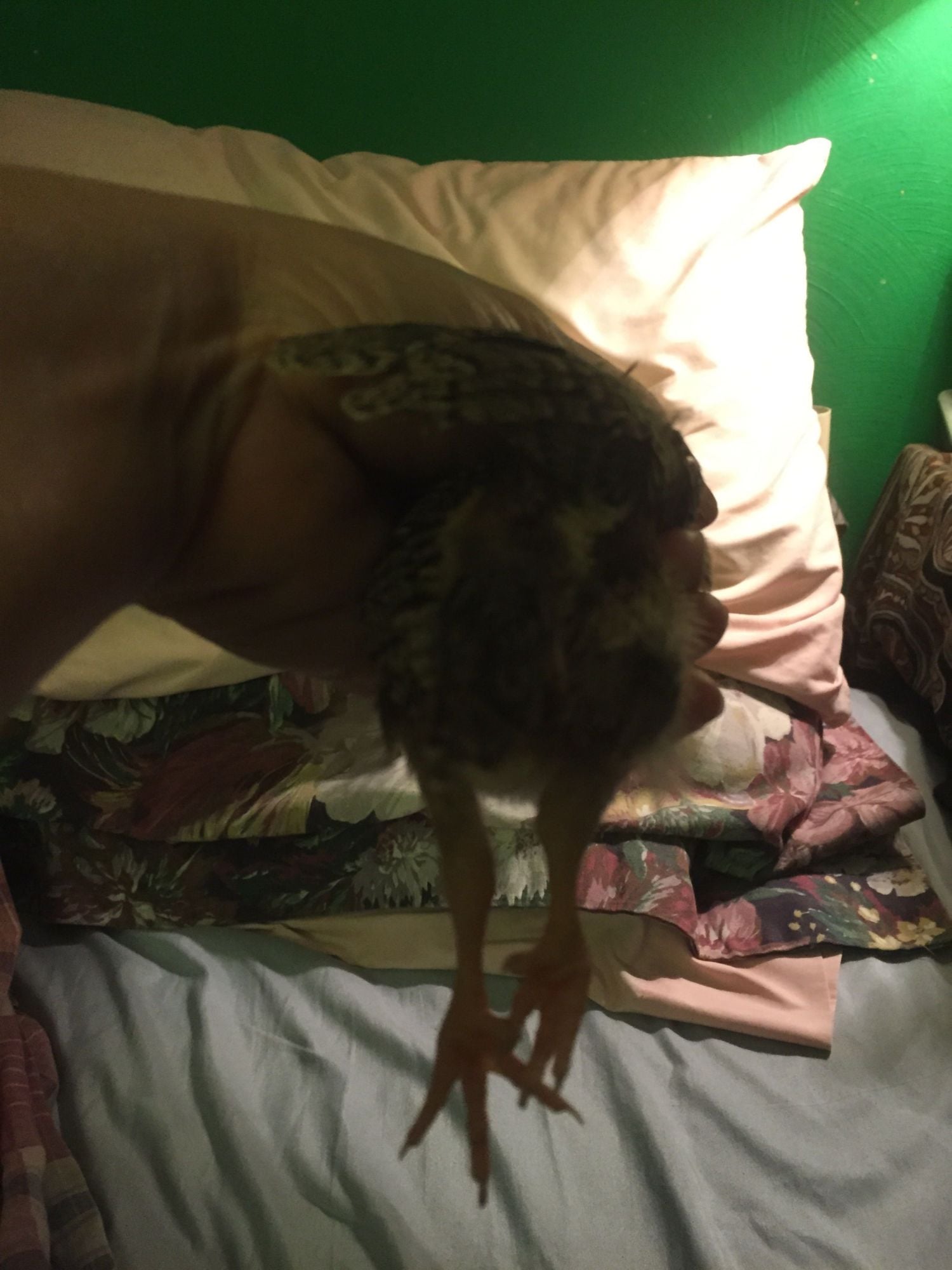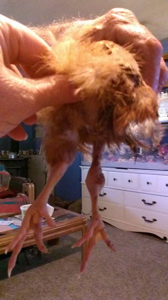 Hold her up with one hand underneath her belly and send me a pic of her leg, dangling down, I need to see both legs together. Here's an example.