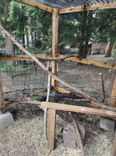 -The coop is situated inside a sizeable run (~8x10) that has all sorts of branches for them to hang out on