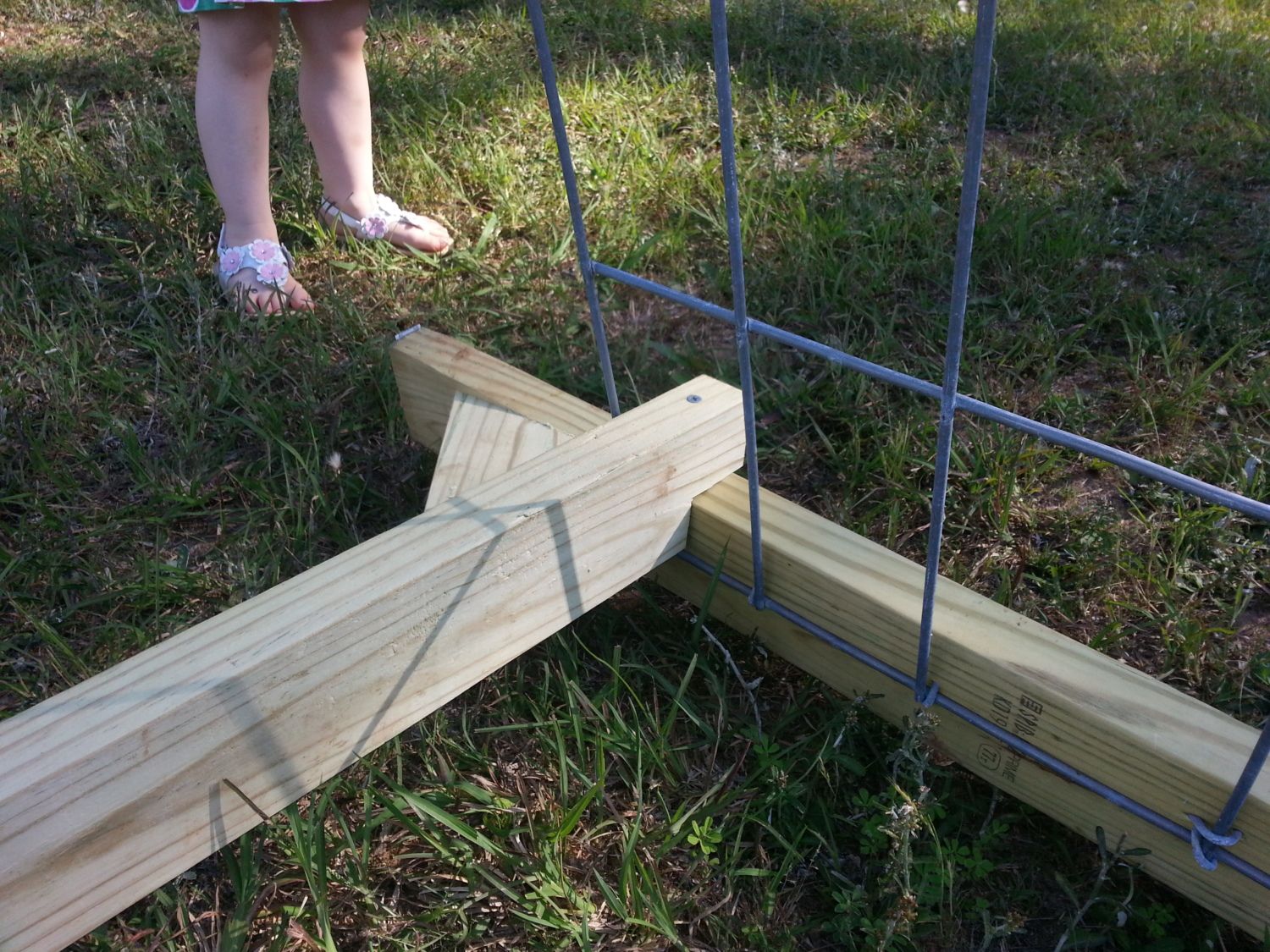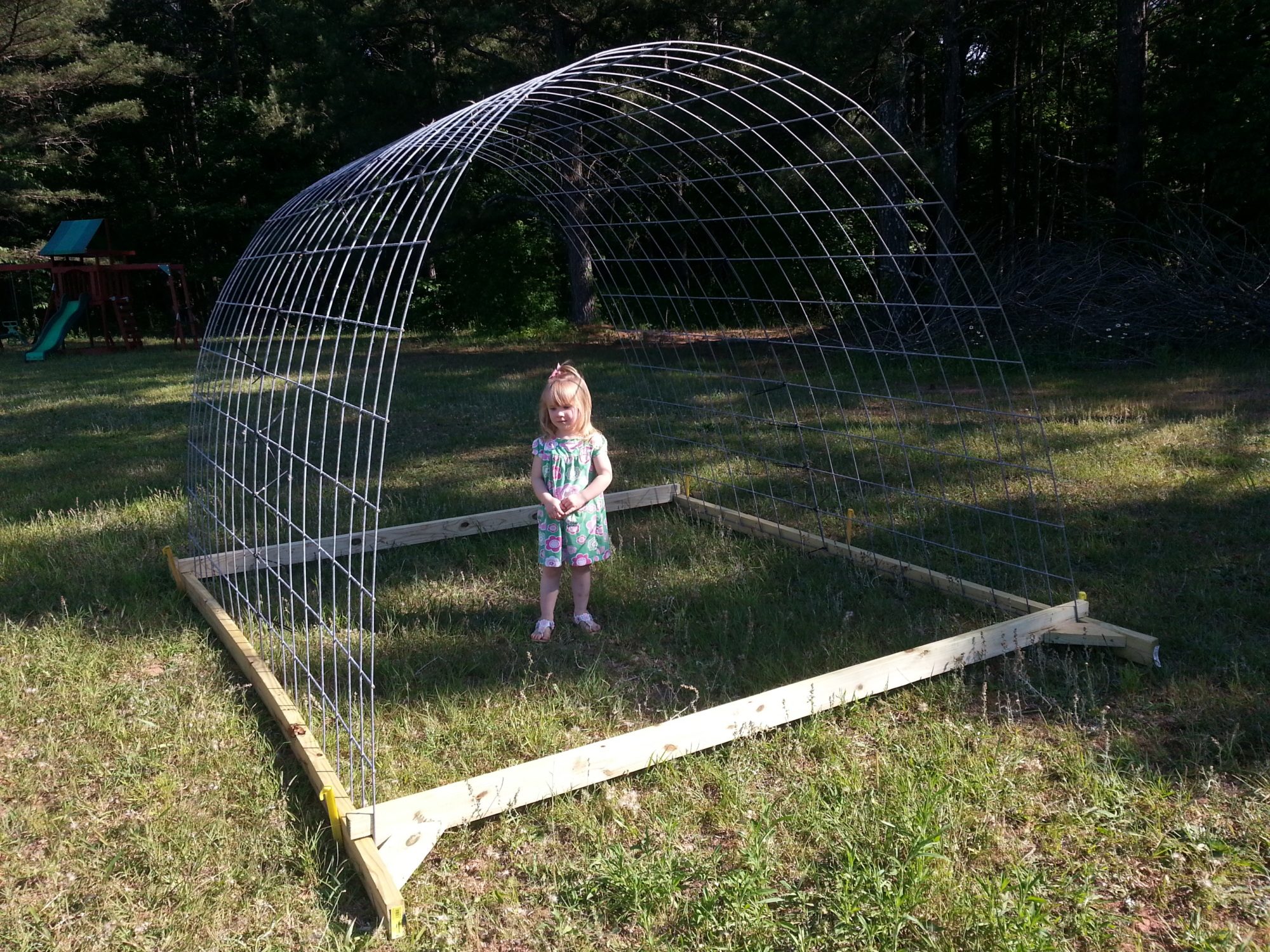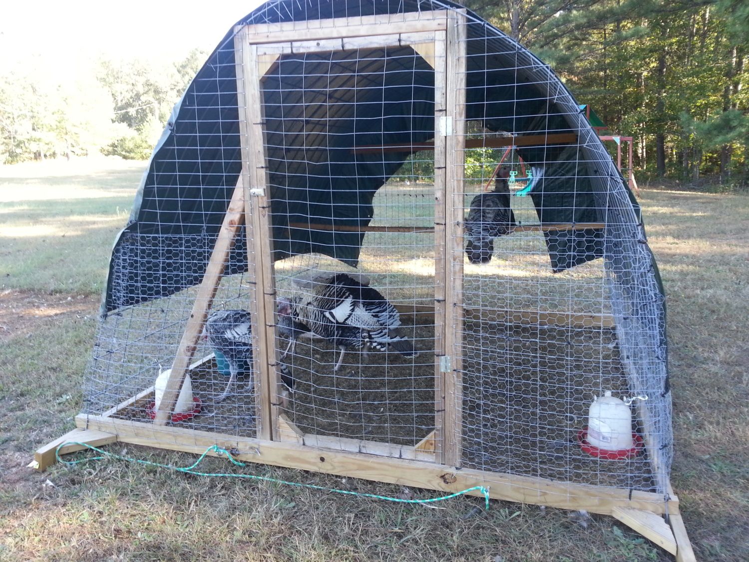 The cattle panels are attached to the 2x4s with fencing staples, and there is are two 2x3s in a cross shape supporting the back wall. The front and rear walls are welded wire, and there is an outer wrap of hex chicken wire because hens can fit through the squares in cattle panels (doesn't seem possible, but she pops right through!), and so can poults, and raccoons, etc.. I attached a 2x4 roost to the inside, and clip their feed bucket and waterers to the wall, or else they'll dump everything by just plain walking over it. For inclement weather, I use those toggle bungee loops to attach extra tarps to the ends of the coop as needed.