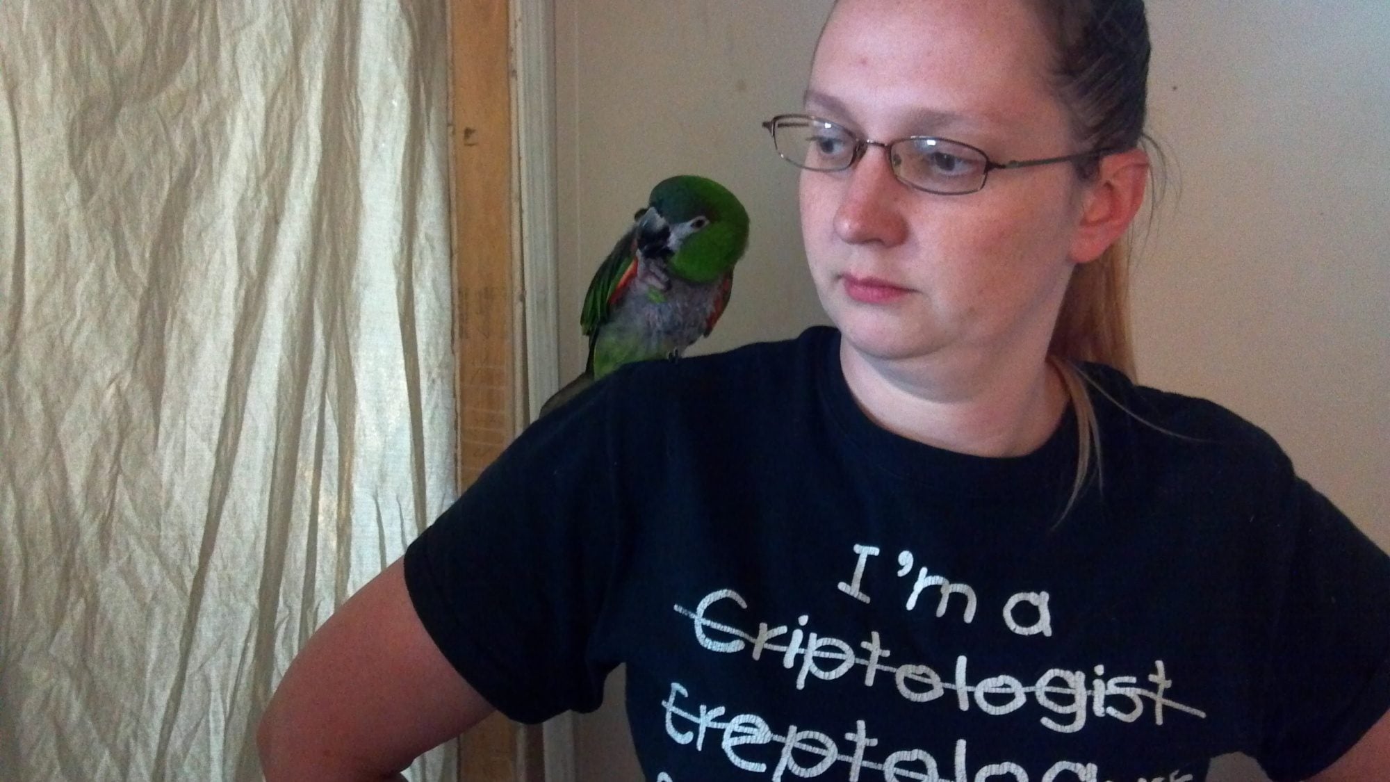 Is that you or Deb holding the bird? That's the Hahn's Macaw, right? Mine was so sweet to me. Tolerated GAM because she did most of the feeding. HATED the kids. It would actually climb off me and run across the room to attack them. It was hilarious.