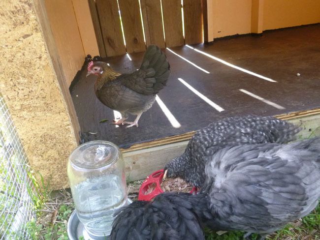 I went to sit with them and drink a beer (important chick bonding time on a saturday and beer helps) when the little bantam started acting strange and staying in the coop and being unusually quiet. Suddenly she went into the back corner and faced the corner and started dropping her wings. I realized she was either dying or about to lay an egg and sho 'nough a minute later a perfect little egg! Actually rather big considering how tiny she is!