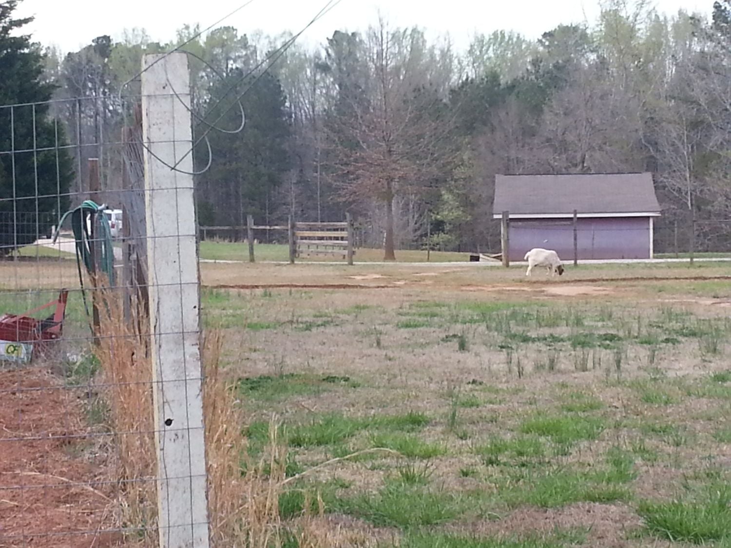 Two-thirds of the kitty committee, and the chairman Tucker (Such a handsome guy). Our neighbor's goat Velma believes the grass is greener on our side of the fence, but she won't let me come closer than I did for the photo, or she'll leave.