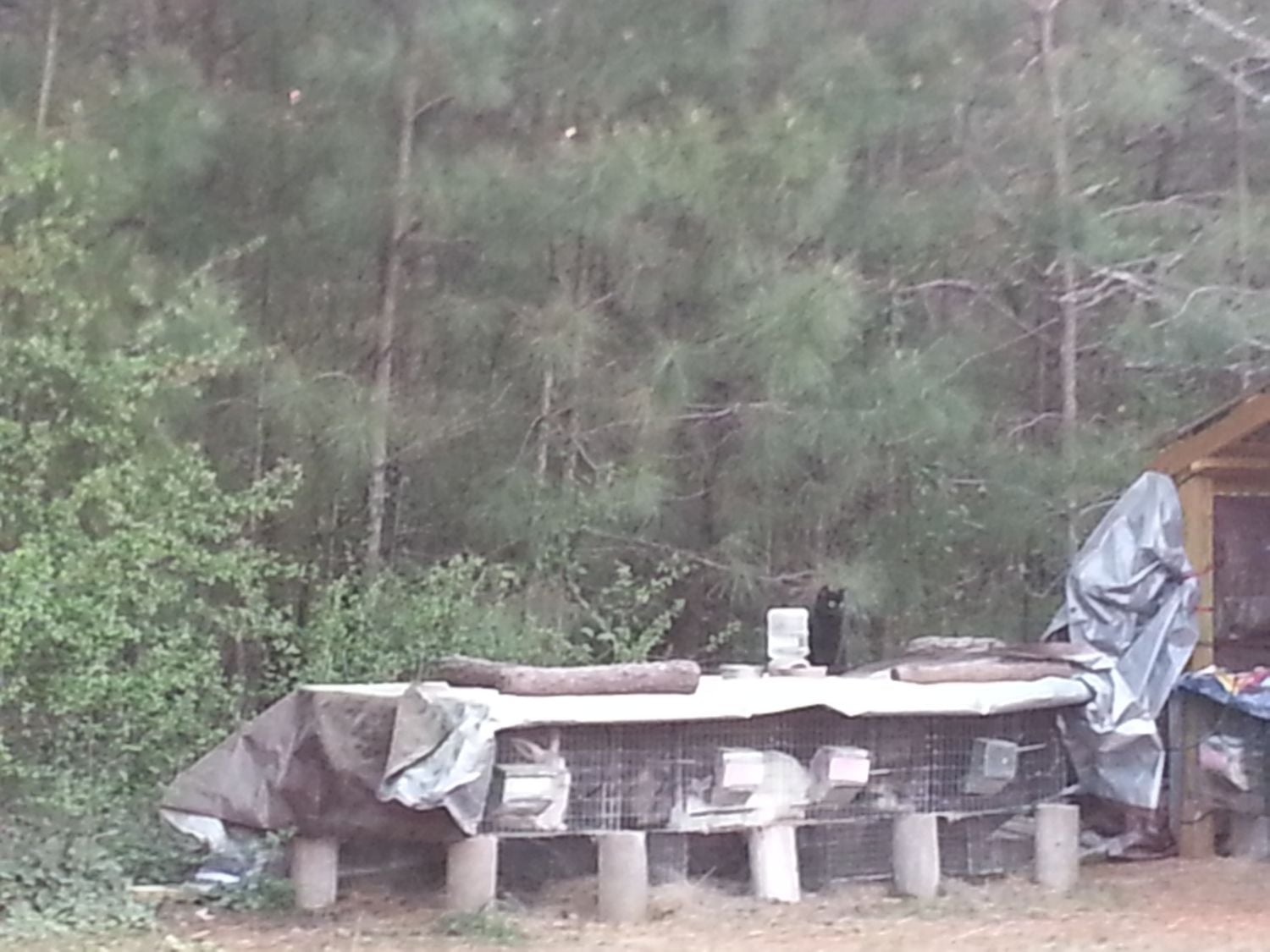 See that black shadow next to the waterer on top of the rabbits? That's "Shadow Ninja" of the Kitty Committee. He appeared silently out of nowhere, and disappeared the same way moments later. This is the first good sighting of him since they were released from their holding pen. We usually just see tracks, and I don't think he hangs out with the other two. He's a secretive little ninja.