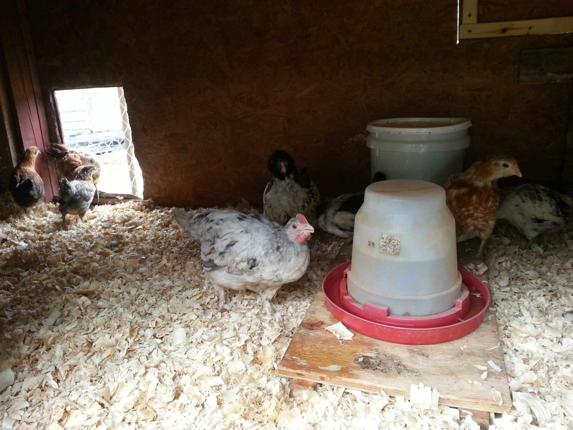 PPS: I couldn't take the mess any more, and all of the oldest chicks were well -feathered out, so... they moved into the big coop. It is 4x8, and filled with a deep layer of fresh pine shavings to cuddle into, so they should be fine. They were super excited to have the extra room, and as expected, no one ventured out into the run. I figured the rain wouldn't matter much, since they'll likely take a few days to get brave enough to leave the coop. @GAMarans , General Pepper is in here; see him with the EE girls and one Sumatra guy?
