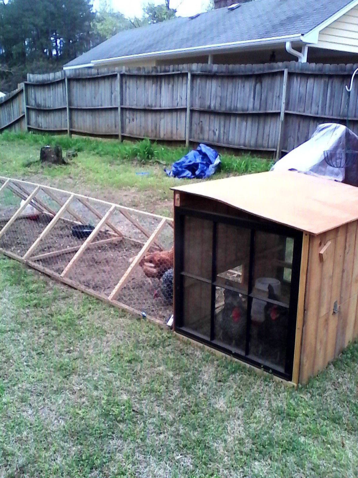 This is my little wheel-less chicken tractor my hubby built for me. Light enough that I just drag it around the yard lol. And with the windows I can look for snakes before I reach in :-)