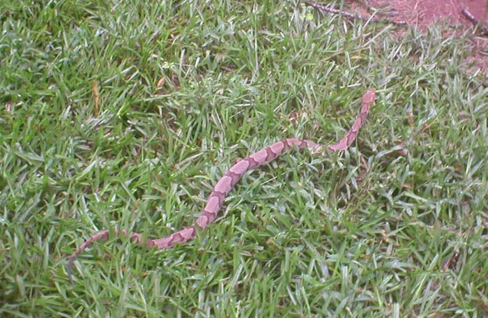 Pic of young copperhead from 2 years ago, being a snake owner I ran out with the camera as soon as the dogs were safely inside, also have pics of the timber rattler (large) but cant find them now: