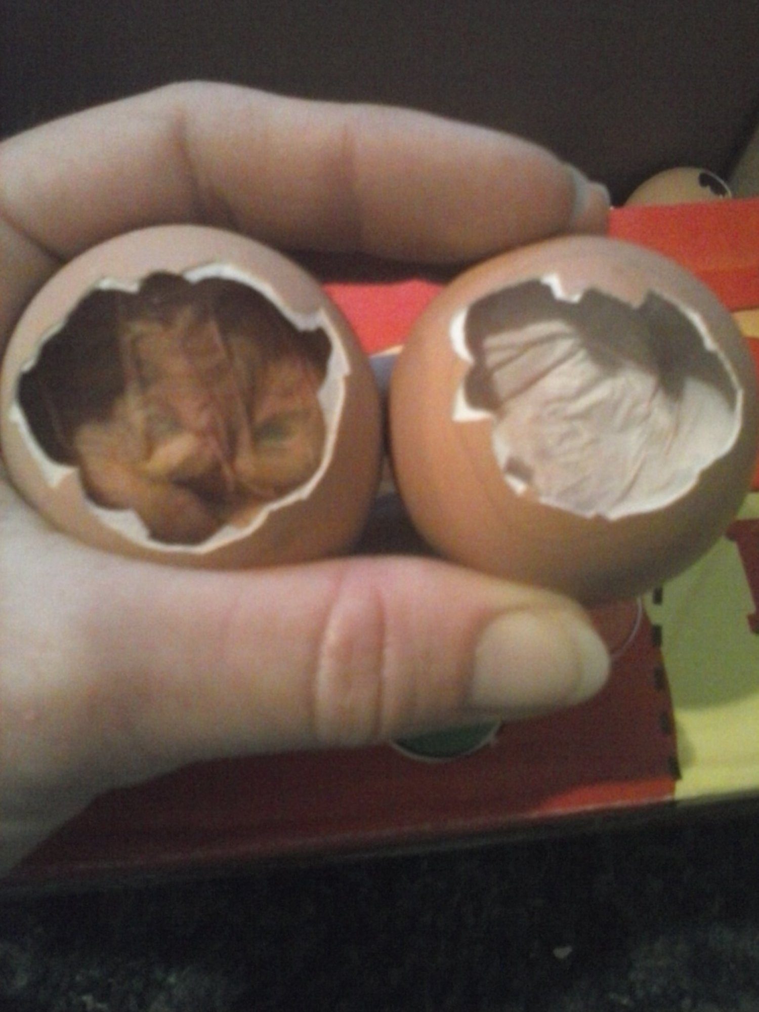 I had shut off the bator when the first 8 that hatched the day before were put in the brooder. past experience for me is that what will hatch healthy hatch around the same few hours. Usually nothing else comes a day after even though I give it time. In the past I've had great success with dry incubating until lockdown then raising humidity to 60%...that was until the last couple of incubations of last year. The chicks had problems with the membrane drying before they got out or either they didn't zip all the way before trying to push out so I figured I'd try keeping the humidity around 70 until the first one hatched, keep it around 75 after that instead of letting it fluctuate after each chick hatches. Eggtopsied this morning cuz no progress or noises anymore, day 23. Here's what I got: a few not positioned for hatch when died, a couple of those with internal pips. 1 With blood filled liquid around it- pipped into vein? 1 dark almost black liquid around it. 2 like the pic one in the pic on the right, most like the one on the left. 2 chicks were so big they filled the entire egg with no air cell- those are the ones I heard yesterday when checking eggs. One of those ripped the membrane with its hind end, the other had internally pipped but there was no air cell for it to continue to breathe until externally pipping! Question: Is the one on the left or the one on the right or both considered shrink wrapped? All developed great so lockdown is my problem obviously.