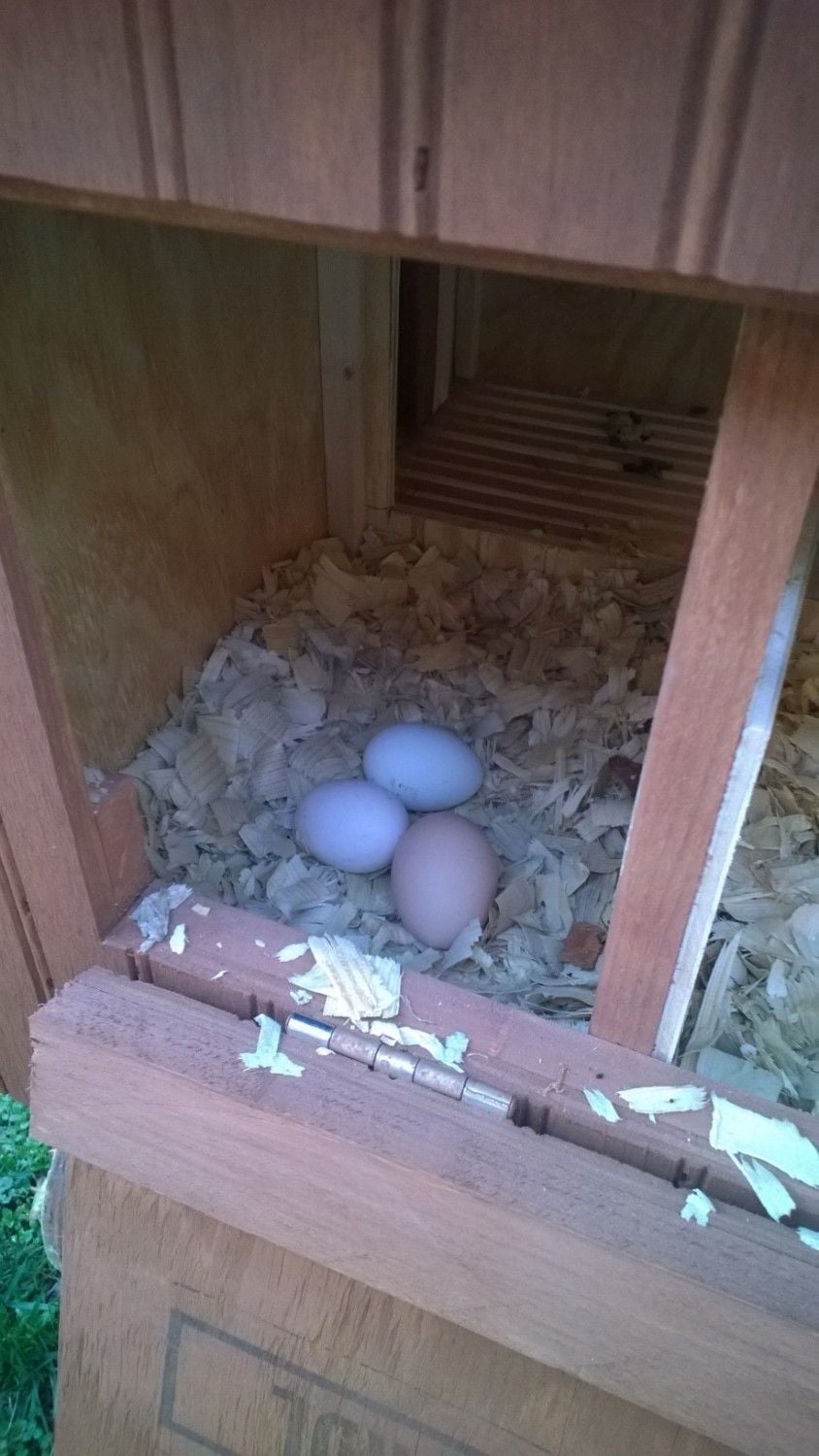 Hey! Welcome to our crazy forum! The coop looks fabulous! From the eggs I see, it looks like the Rhodebar has not laid yet. You know, she is really young and I thought I was getting pullet eggs from her. Hers will be small brown eggs until they get bigger. Houdini lays the light blue one, Penny lays the whitish one and Emma lays the larger brown one. They looks so happy!