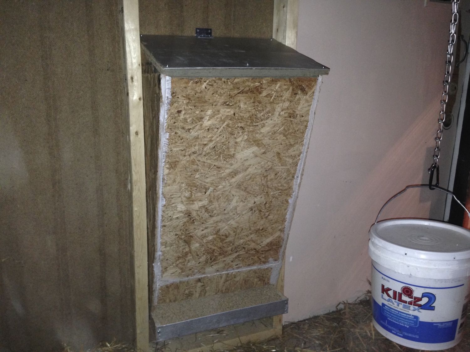 my 'between the studs' feeder I built out of left over sheeting. Lined the inside with left over galvanized metal from the roof: