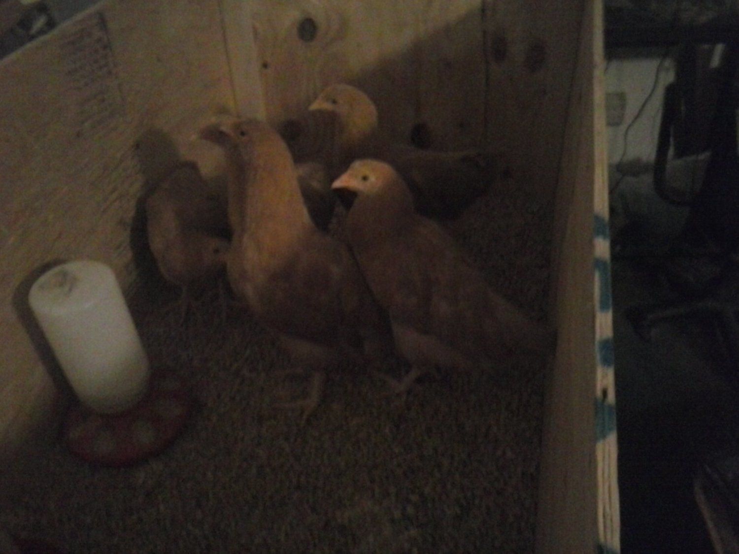 Katsdar-Here are your girls. They're in my larger brooder for the moment. Still gotta get the roof fixed on the quarantine coop and they'll go out there until the swap :). The phone on my camera isn't the best.
