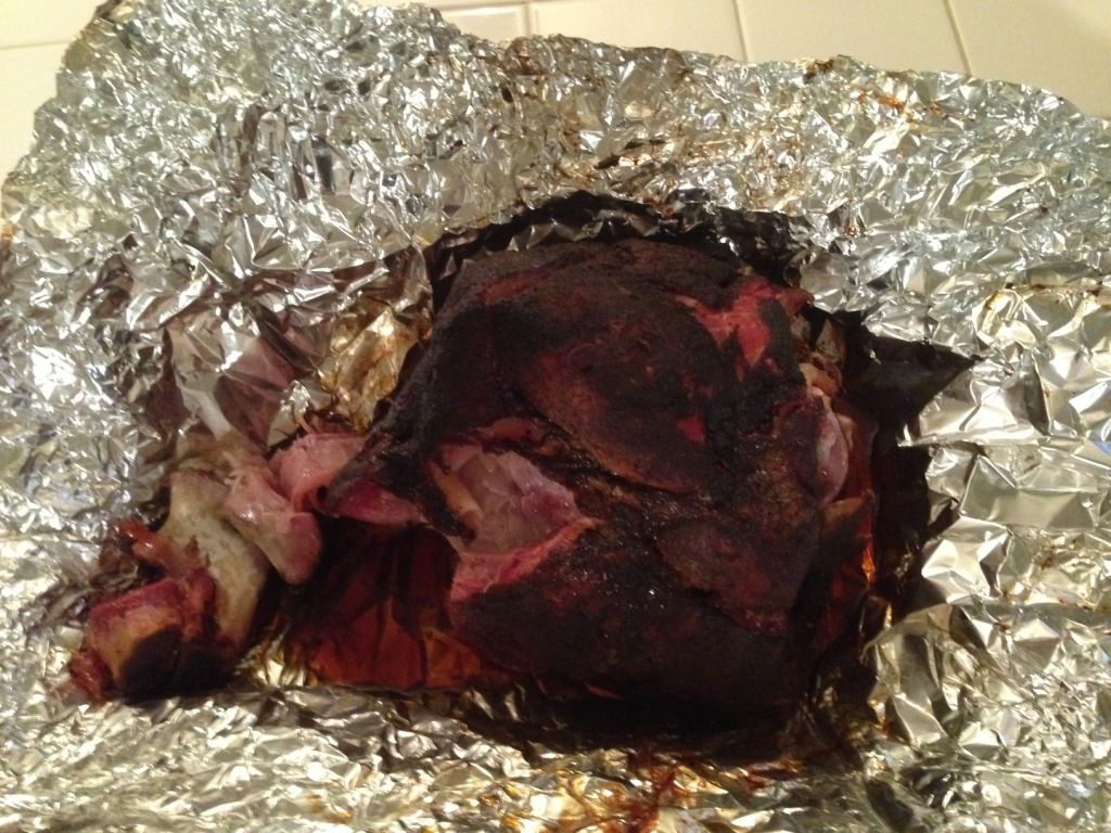 ok just have taken the roast off the smoker, 208* internal temp, bone pulled out means it's done! Gonna give it 20 or 30 minutes rest then I'll pull it apart.