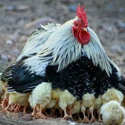 I have had a roo like this somtimes if they are the only roo in the yard and he breeding he got more sense than people think he understands that they just maybe his chicks lol soo cute this picture.