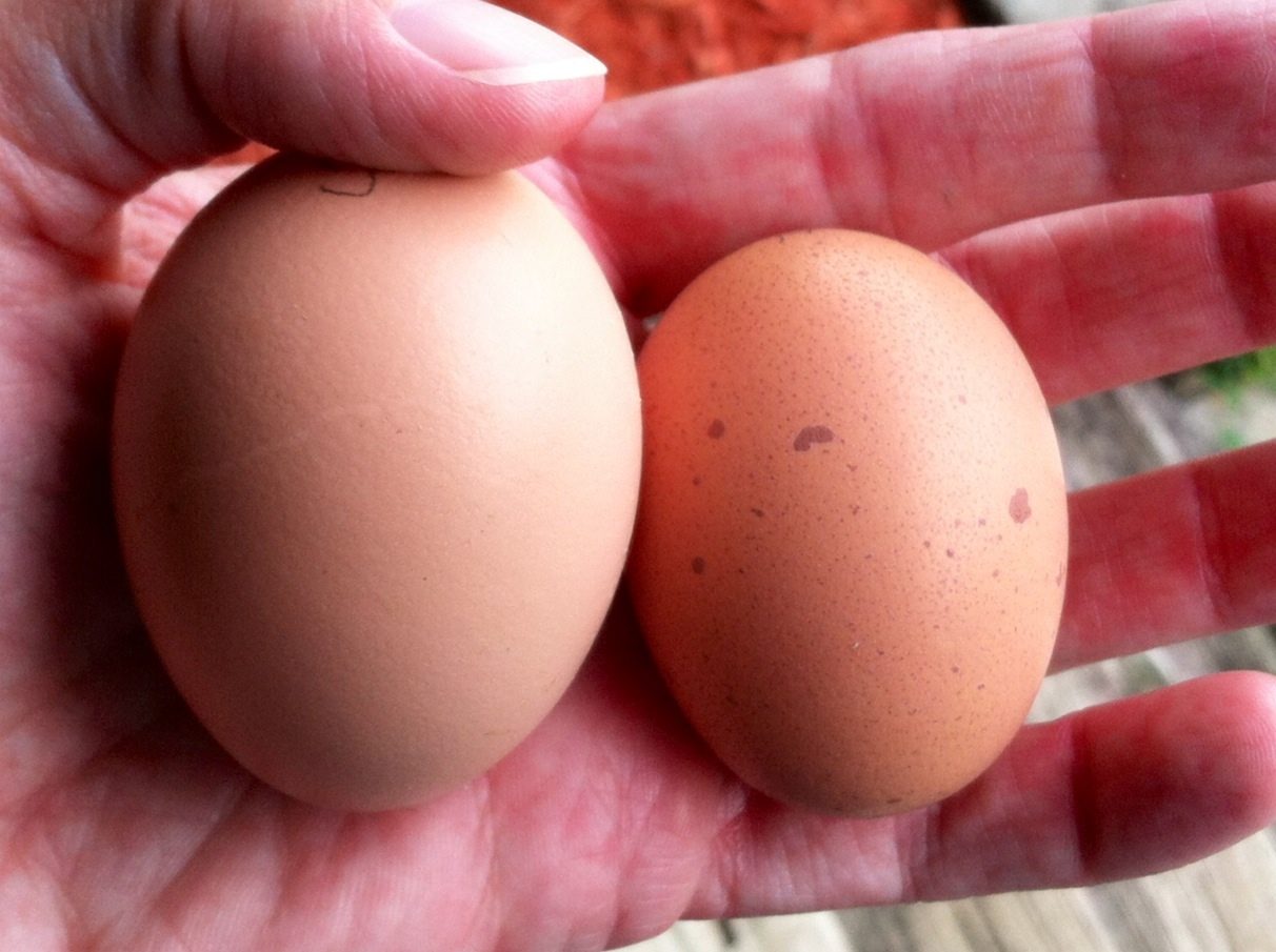 lol. Sorry. The small one on the right. The left is from my BR pullet who has been laying a few weeks now. I will say though, the Olive landed the first egg INSIDE the laying box with no persuasion on my part- and no guidance from an older girl as the BR lays on the coop floor! :clap