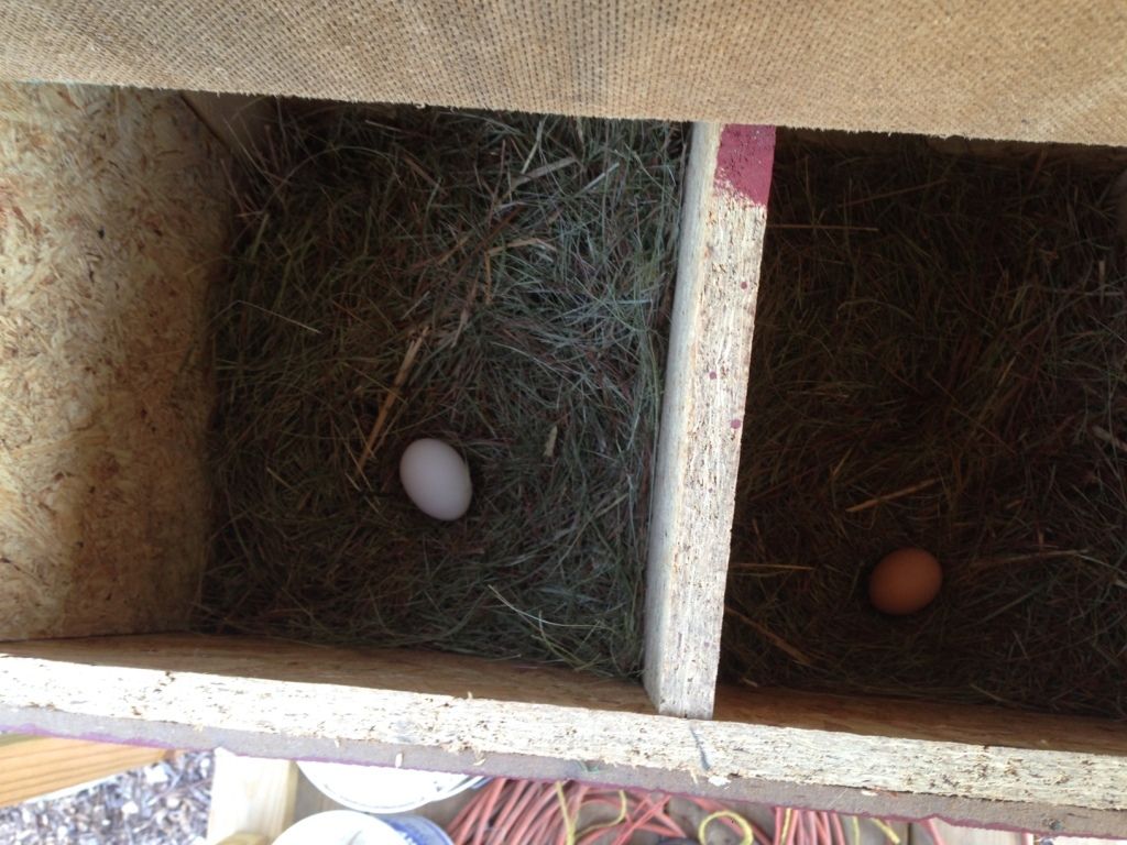 large white egg in the end box. This is the nest she's pretty much used every day except the one time she laid it in the floor, and a medium sized brown in the middle box.....where the other leghorn was sitting, LOL