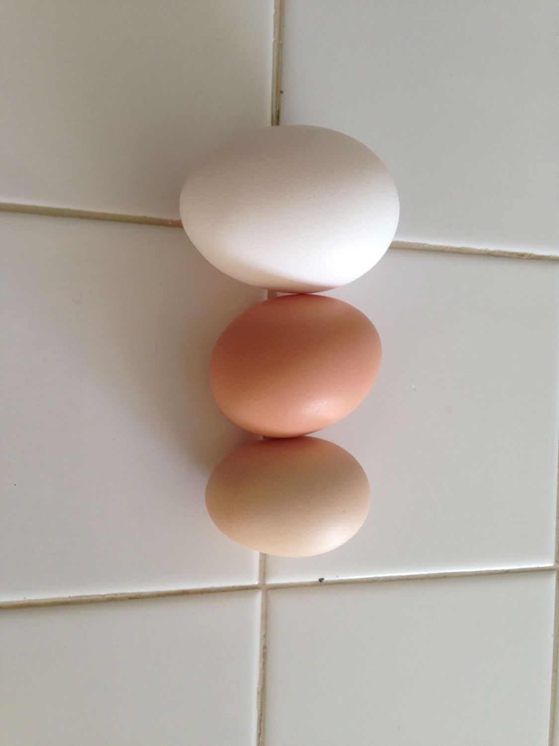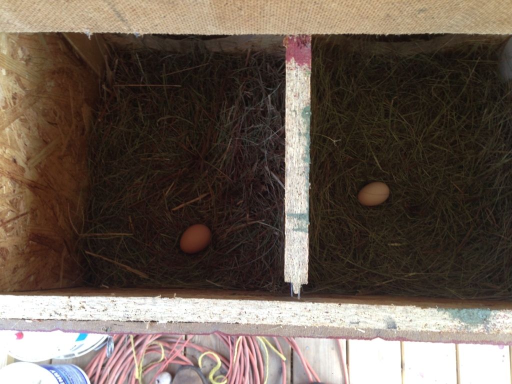 so one aussie in the end nest, a white leghorn in the other two. Funny they're all using different boxes, I'm betting they'll all be using the same one soon enough. Anyway, had some stuff to do and came home and checked the nests, here's what I have: