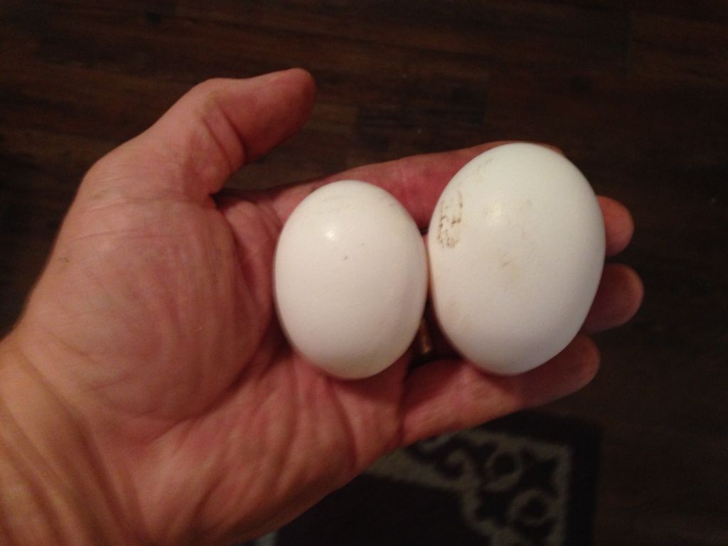 I got this egg from my white leghorn yesterday. I've been watching her this morning to make sure I didn't need to give her an ice pack to sit on. You see it compared to one of her normal eggs and in the carton with others. The pic doesn't do it justice really, as far as how big around it really is. I'm going to make sure we keep this one so I can see if I can make a '3 egg omelette' with just this one egg