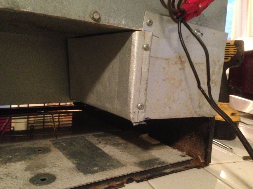 I had a piece of scrap flashing, and built a box to close it off. Still not air tight, but much better than it was. If this seems to help, I will silicone around it and seal it off a bit better, if it's not helping any at all, I'll scrap it, cover the hole and order a new heater/fan to put inside.