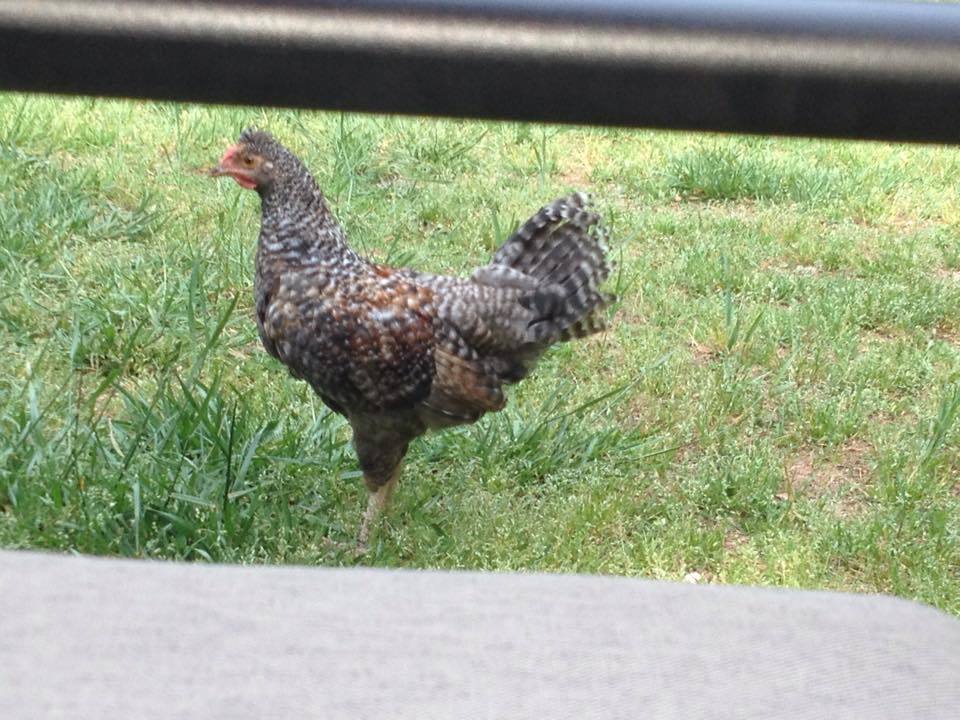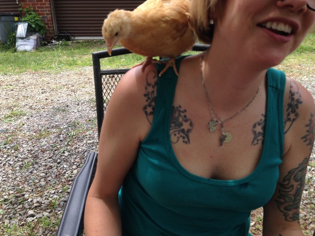 pic of the day, Katiedarling with chicken poo on her shoulder, look close at her shirt you can see the wet spot, seems it had just dropped off to the ground right as I snapped the shot.