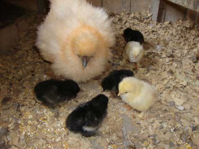 Woke up to find my new "incubator" works great! So far, 4 of the 6 eggs have hatched. Not sure about the other 2 since I haven't moved Mom to see. This is my 1st broody hatch! It sure is easier than the electrical incubators! The black chicks are cochins and the yellow ones are cochin mixes. All have their daddy's feathered legs!